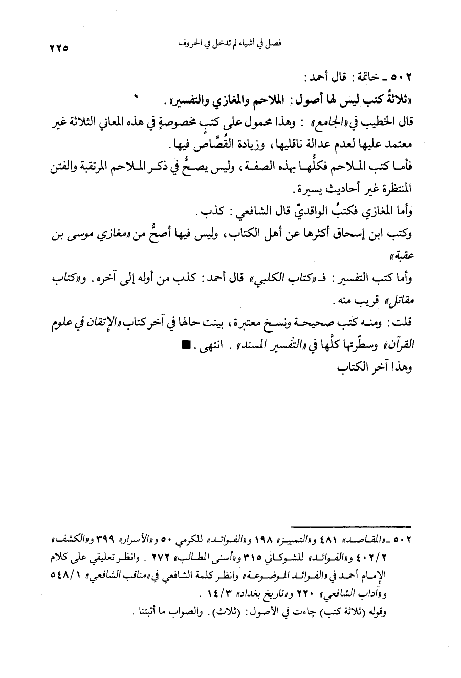 - قال أحمد: ثلاث كتب ليس لها أصول: الملاحم والمغازي والتفسير. قال الخطيب في الجامع: هذا محمول على كتب مخصوصة في هذه المعاني الثلاثة غير معتمد عليها، لعدم عدالة ناقليها وزيادة القصاص فيها.
