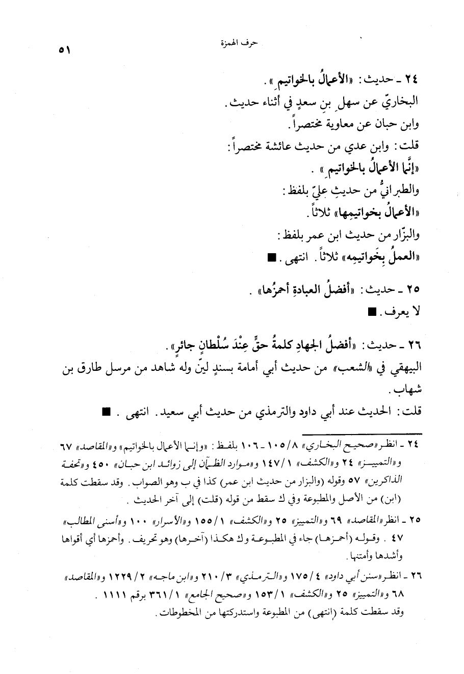 24 - (حديث) "الأَعْمَالُ بِالْخَوَاتِيمِ" البخاري عن سهل بن سعد في أثناء حديث، وابن حبان عن معاوية مختصرا.