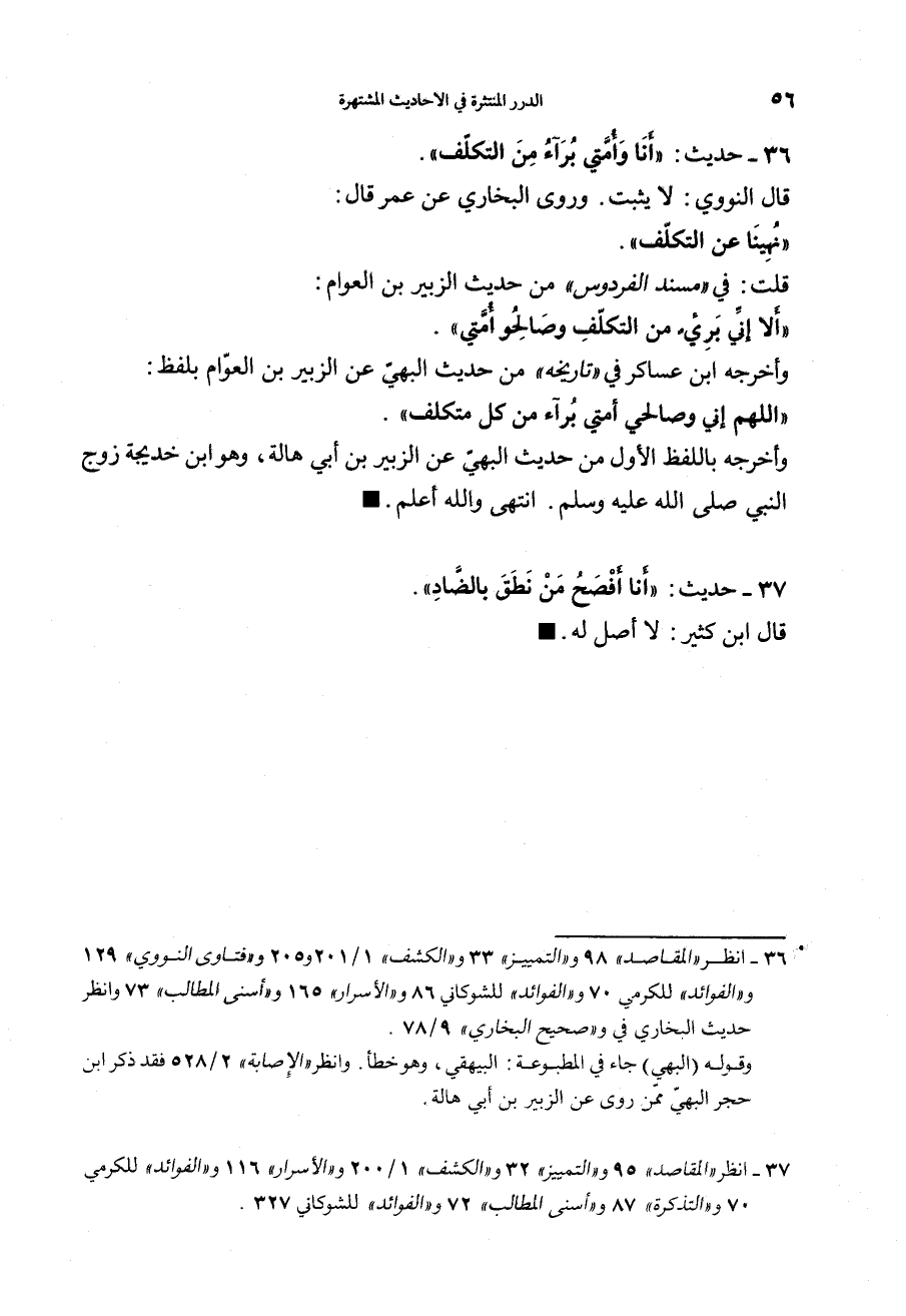 36 - (حديث) "أَنَا وَأُمَّتِي بُرَآءُ مِنَ التَّكَلُّف" قال النووي: لا يثبت، وروى البخاري عن عمر قال: نُهينَا عَنِ التَّكَلُّفِ".