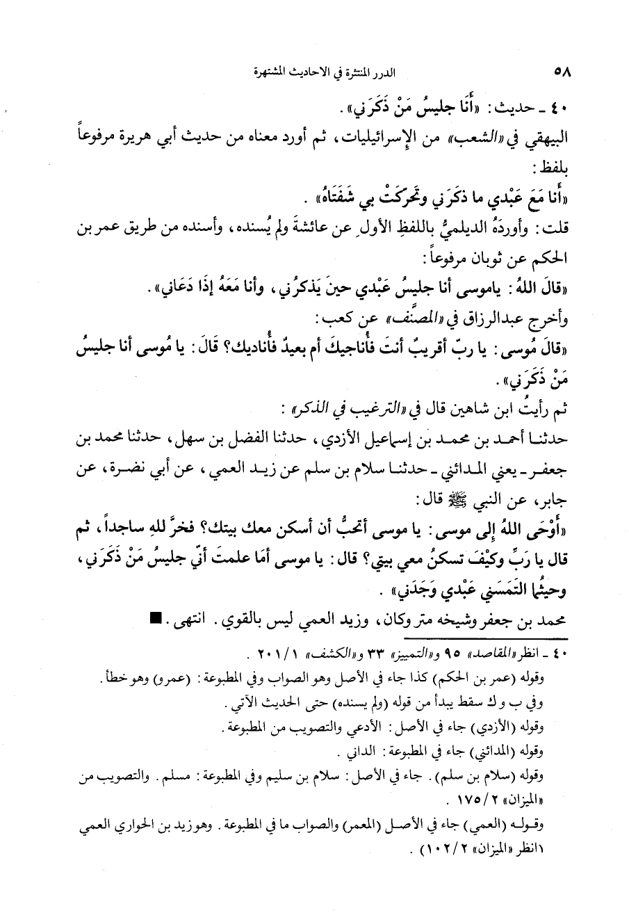 40 - (حديث) "أنَا جَلِيسُ مَنْ ذَكَرَنِي" البيهقي في الشعب من الإسرائيليات، ثم أورد معناه من حديث أبي هريرة مرفوعا بلفظ: "أَنَا مَعَ عَبْدِي مَا ذَكَرَنِي وَتَحَرَّكَتْ بِي شَفَتَاهُ".