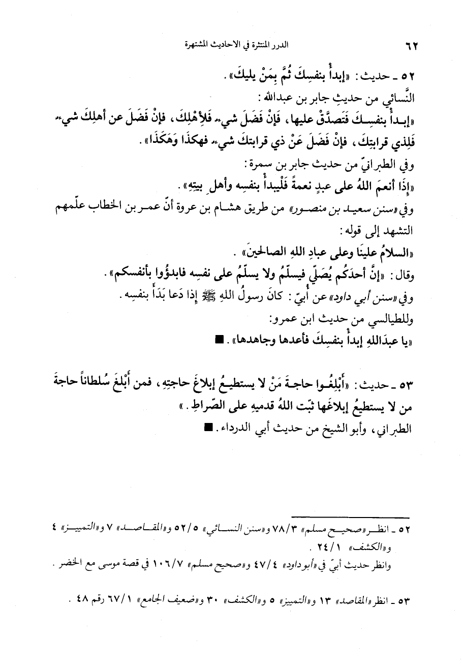 52 - (حديث) "ابْدَأْ بِنَفْسِكَ ثُمَّ بِمَنْ يَليِكَ" النسائي من حديث جابر بن عبد اللَّه "ابْدَأْ بِنَفْسِكَ فَتَصَدَّقْ عَلَيْهَا، فَإِنْ فَضَلَ شَيْءٌ فَلأَهْلِكَ، فَإنْ فَضَلَ عَنْ أهْلِكَ شَيْءٌ فَلِذِي قَرابَتِكَ، فَإنْ فَضَلَ عَنْ ذِي قَرَابتِكَ شَيْءٌ فَهكّذَا وَهكَذَا" وفي الطبراني من حديث جابر بن سمرة: "إِذَا أنْعَمَ اللهُ عَلَى عَبْدٍ نِعْمَةً فَلْيَبْدَأْ بِنَفْسِهِ وَأهْلِ بَيْتِهِ" وفي سنن سعيد بن منصور من طريق هشام بن عروة "أنَّ عُمَرَ بْنَ الْخَطَّابِ علَّمَهُمُ التَّشَهُّدَ إلَى قَوْلِهِ: السَّلاَمُ عَلَيْنَا وَعَلَى عِبَادِ اللهِ الصَّالِحِينَ، وقال: إنَّ أحّدّكُمْ يُصَلِّي فَيُسَلِّمُ وَلاَ يُسَلِّمُ عَلَى نَفْسِهِ، فَابْدَءُوا بِأَنْفُسِكُمْ" وفي سنن أبي داود عن أبيّ: "كاَنَ رَسُولُ اللهِ صَلَّى اللهُ عَلَيْهِ وَسَلَّمَ إذَا دَعَا بَدَأَ بِنَفْسِهِ" وللطيالسي من حديث ابن عمرو: "يَا عَبْدَ اللهِ ابْدَأْ بِنَفْسِكَ فَعَادِهَا وَجَاهِدْهَا" والله أعلم.
