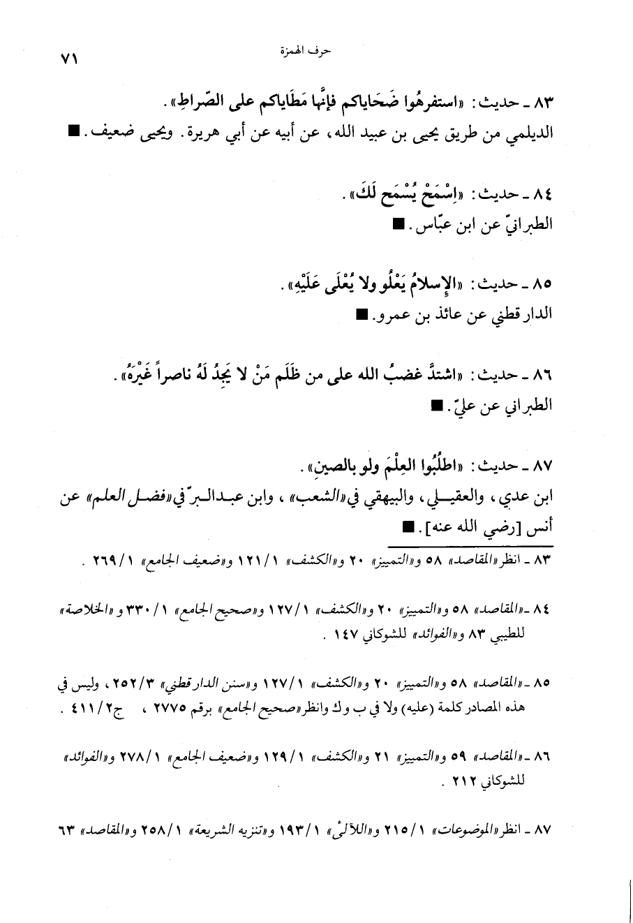 83 - (حديث) "اسْتَفْرِهُوا ضَحَايَاكُمْ فَإِنَّهَا مَطَايَاكُمْ عَلَى الصِّرَاطِ" الديلمي من طريق يحيى بن عبيد الله، عن أبيه، عن أبي هريرة، ويحيى ضعيف.