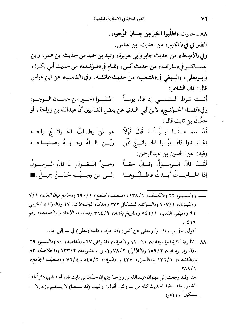 88 - (حديث) "اطْلُبوا الْخَيْرَ مِنْ حِسَانِ الْوُجُوهِ" الطبراني في الكبير من حديث ابن عباس، وفي الأوسط من حديث جابر وأبي هريرة، وعبد بن حميد من حديث ابن عمر، وابن عساكر في تاريخه من حديث أنس. وتمامه في فوائده من حديث أبي بكرة، وأبو يعلى والبيهقي في الشعب من حديث عائشة. وفي الشعب عن ابن عباس قال الشاعر: