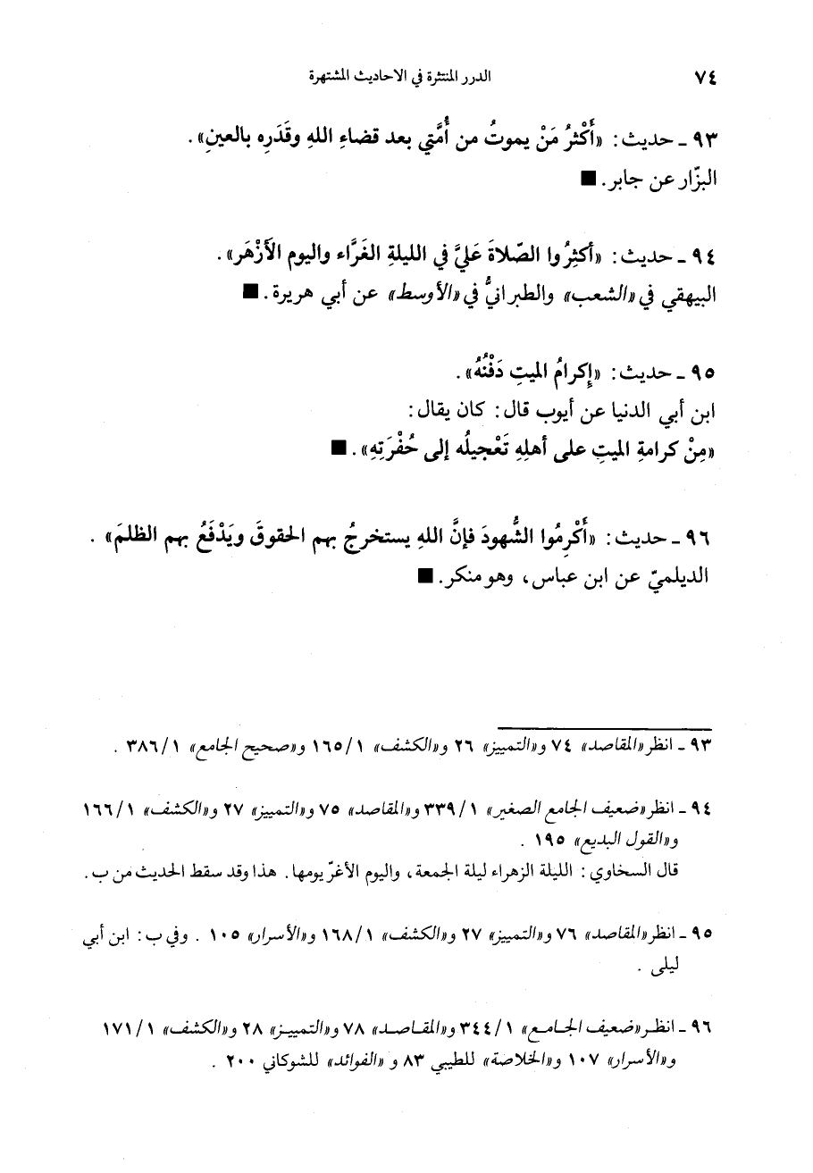 94 - (حديث) "أَكْثِرُوا مِنَ الصَّلاَةِ عَلَيَّ في اللَّيْلَةِ الْغَرَّاءِ والْيَوْمِ الأَزْهَرِ" البيهقي في الشعب والطبراني في الأوسط عن أبي هريرة.