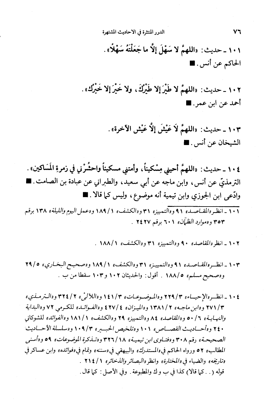 104 - (حديث) "اللَّهُمّ أَحِيِنِي مِسْكِيناً، وَأَمِتْنِي مِسْكِيناَ، وَاحْشُرْنِي فِي زُمْرَةِ المَسَاكِينِ" الترمذي عن أنس وابن ماجه عن أبي سعيد والطبراني عن عبادة بن الصامت. وادعي ابن الجوزي وابن تيمية أنه موضوع، وليس كما قالا.