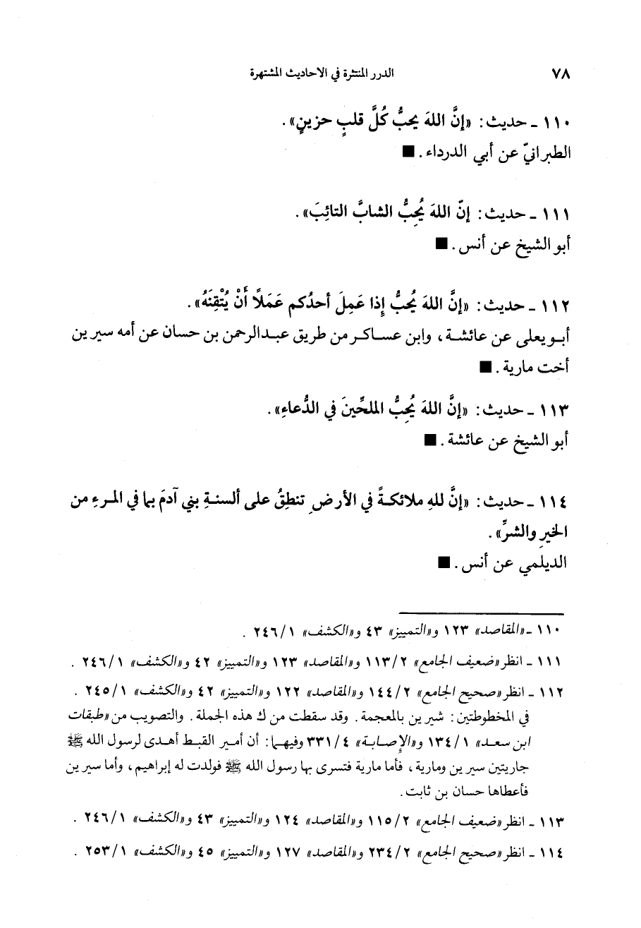 112 - (حديث) "إِنَّ اللهَ يُحِبُ إِذَا عَمِلَ أَحَدُكُمْ عمَلاً أَنْ يُتْقِنَهُ" أبو يعلى عن عائشة، وابن عساكر من طريق عبد الرحمن بن حسان عن أمه سيرين أخت مارية.