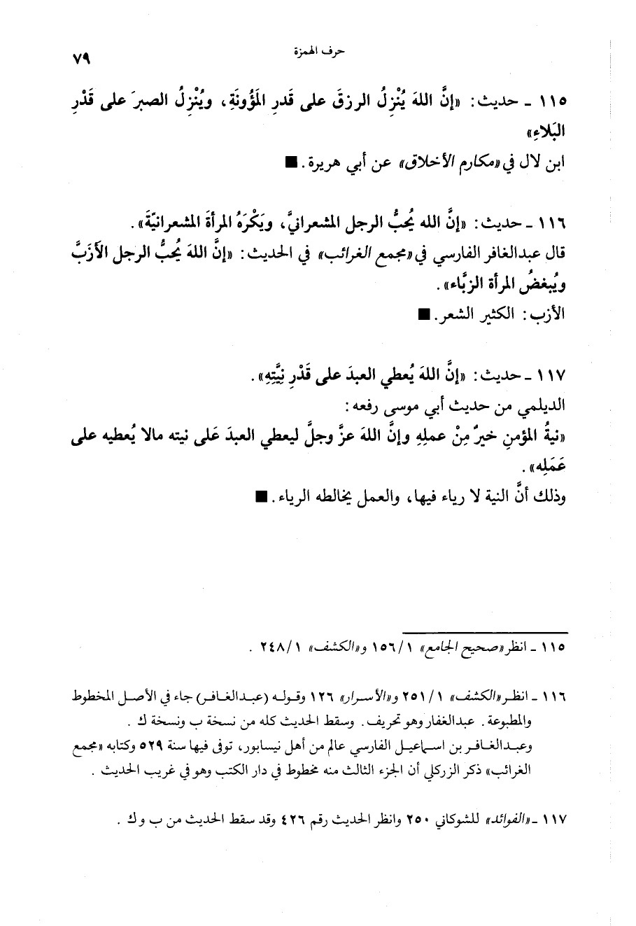 116 - (حديث) "إِنَّ اللهَ يُحِبُّ الرَّجُلَ المُشْعرَانِيَّ، وَيَكْرَهُ المَرْأَةَ المُشْعَرَانِيَّةَ" قال عبد الغفار الفارسي في مجمع الغرائب في الحديث: "إِنَّ اللهَ يُحِبُّ الرَّجُلَ الأَزَبَّ، وَيَبْغُضُ المَرْأَةَ الزَّبَاءَ" الأزب: الكثير الشعر.