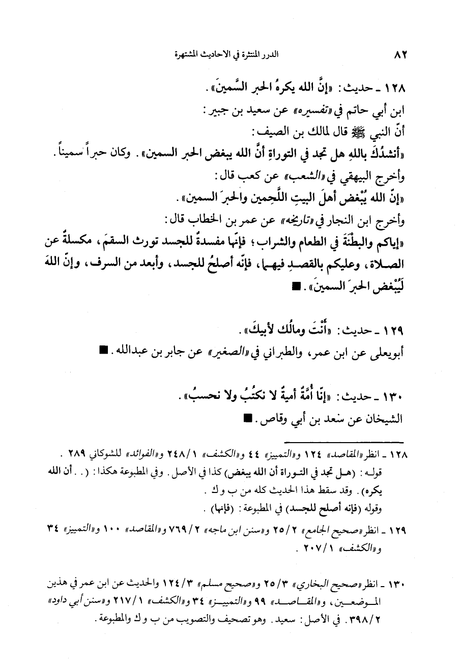 128 - (حديث) "إِنَّ يَكْرَهُ الْحَبْرَ السَّمِينَ" ابن أبي حاتم في تفسيره عن سعيد بن جبير: "أَنَّ النَّبيَّ صَلَّى اللهُ عَلَيْهِ وَسَلَّمَ قَالَ لِمَالِكِ بْنِ الصَّيْفِ: أَنْشُدُكَ بِاللهِ هَلْ تجِدُ فِي التَّوْرَاةِ: إِنَّ اللهَ يَكْرَهُ الحَبْرَ السَّمِينَ وَكَانَ حَبْراً سَمِيناً" وأخرج البيهقي في الشعب عن كعب قال: "إِنَّ اللهَ يَبْغُضُ أَهْلَ الْبَيْتِ اللّحْمِيِّينَ، وَالْحَبْرَ السَّمِينَ" وأخرج ابن النجاري في تاريخه عن عمر بن الخطاب قال: "إيَّاكُمْ وَالْبِطْنَةَ في الطَّعَامِ وَالشَّرَابِ، فَإنَّهَا مَفْسَدَةٌ لِلْجَسَدِ تُورِثُ السَّقَمَ، مَكْسَلَةٌ عَنِ الصَّلاَةِ. وَعَلَيْكُمْ بِالْقَصْدِ فِيهِمَا فَإِنَّهَا أَصْلَحُ لِلْجَسَدِ وَأَبْعَدُ مِنَ السَّرَفِ، وَإِنَّ اللهَ لَيَبْغُضُ الْحَبْرَ السَّمِينَ".