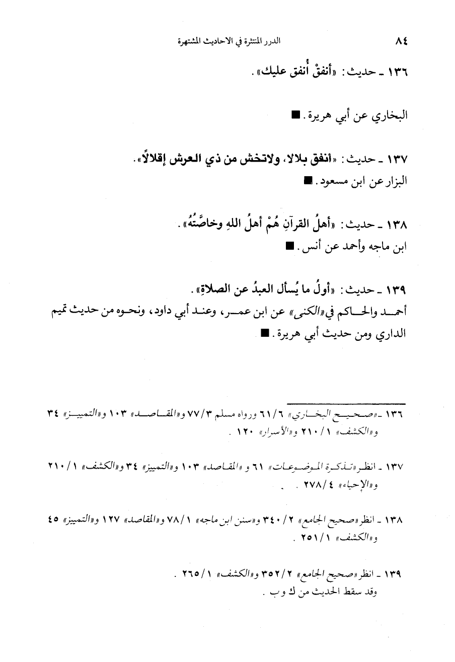 137 - (حديث) " أَنْفِقْ بِلاَلاً، وَلاَ تَخْشَ مِنْ ذِي الْعَرْشِ إقْلاَلاً" البزار عن ابن مسعود رضي الله تعالى عنه.