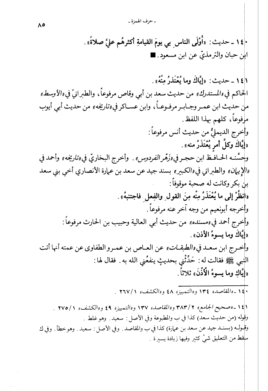 141 - (حديث) "إِيَّاكَ وَمَا يُعْتَذَرُ مِنْهُ" الحاكم في المستدرك من حديث سعد بن أبي وقاص مرفوعاً، والطبراني في الأوسط من حديث ابن عمر وجابر مرفوعاً، وابن عساكر في تاريخه من حديث ابن أبي أيوب مرفوعاً كلهم بهذا اللفظ. وأخرج الديلمي من حديث أنس مرفوعاً: "إِيَّاكَ وَكلَّ أَمْرٍ يُعْتَذَرُ مِنْهُ" وحسنه الحافظ ابن حجر في زهر الفردوس. وأخرج البخاري في تاريخه، وأحمد في الإيمان، والطبراني في الكبير بسند جيد عن سعد بن عمارة الأنصاري أخي بني سعد ابن أبي بكر وكانت له صحبة موقوفاً "انْظُرْ إِلَى مَا يُعْتَذَرُ مِنْه مِنَ الْقَوْلِ وَالْفِعْلِ فَاجْتَنِبْهُ" وأخرجه أبو نعيم من وجه آخر عنه مرفوعاً. وأخرج أحمد في مسنده من حديث أبي العالية وحبيب ابن الحارث مرفوعاً: "إِيَّاكَ وَمَا يَسْوءُ الأُذُنَ" وأخرج ابن سعد في الطبقات عن العاص بن عمرو الطفاوي عن عمته: "أَنَّهَا أَتَتِ النَّبيَّ صَلَّى اللهُ عَلَيْهِ وَسَلَّمَ، فَقَالَتْ لَهُ: حَدِّثْنِي بِحَدِيثٍ يَنْفَعُنِي اللهُ بِهِ، فَقَاَل: إِيَّاكِ وَمَا يَسْوءُ الأُذُنَ ثَلاَثاً"