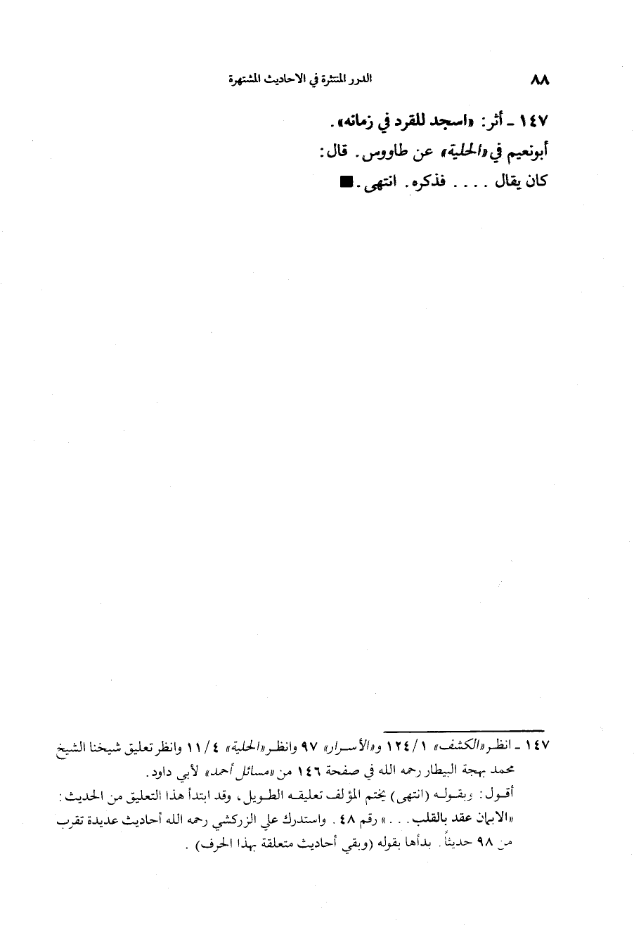 147 - (أثر) "اسْجُدْ لِلْقِرْدِ في زَمَانِهِ" أبو نعيم في الحلية عن طاوس قال: كان يقال فذكره انتهى.