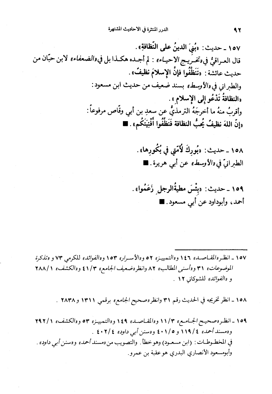157 - (حديث) "بُنِيَ الدَّينُ عَلَى النَّظَافَةِ" قال العراقي في تخريج الإحياء لم أجده هكذا، بل في الضعفاء لابن حبان من حديث عائشة: "تَنَظَّفُوا فَإِنَ الإِسْلاَمَ نَظِيفٌ" وللطبراني في الأوسط بسند ضعيف من حديث ابن مسعود: "النَّظَافَةُ تَدْعُو إِلَى الإِسْلاَمِ" وأقرب منه ما أخرجه الترمذي عن سعد بن أبي وقاص مرفوعاً: "إنَّ اللهَ نَظِيفٌ يُحِبُّ النَّظَافَةَ، فَنَظِّفُوا أَفْنِيَتَكُمْ".