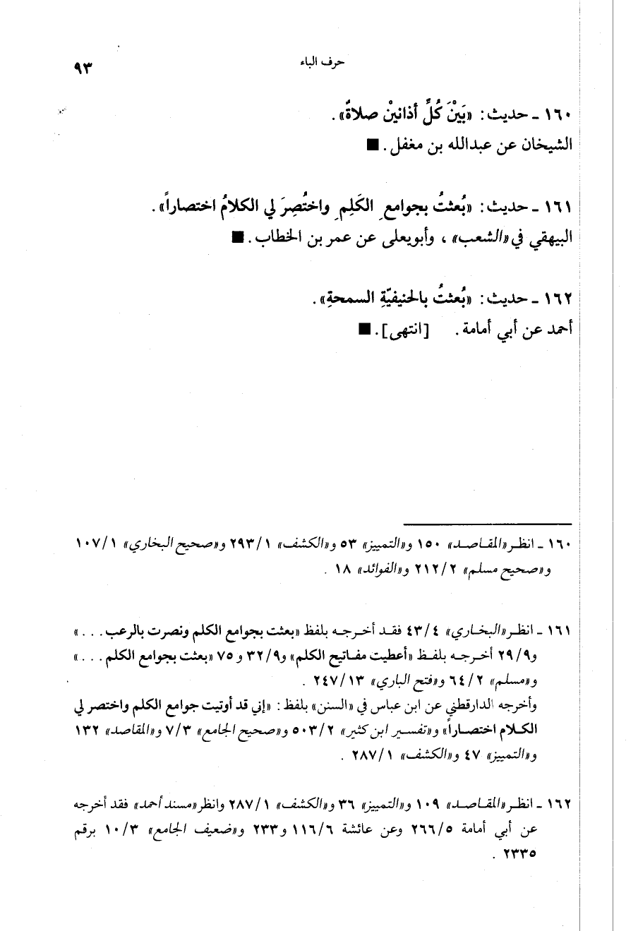 161 - (حديث) "بُعِثْتُ بِجَوامعِ الْكَلِمِ، وَاخْتُصِرَ لِيَ الْكَلاَمُ اخْتِصَاراً" البيهقي في الشعب، وأبو يعلى عن عمر بن الخطاب رضي الله تعالى عنه.