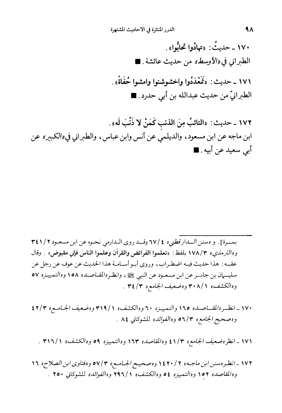 172 - (حديث) "التَّائِبُ مِنَ الذَّنْبِ كَمَنْ لاَ ذَنْبَ لَهُ" ابن ماجه عن ابن مسعود والديلمي عن أنس وابن عباس والطبراني في الكبير عن أبي سعيد عن أبيه.