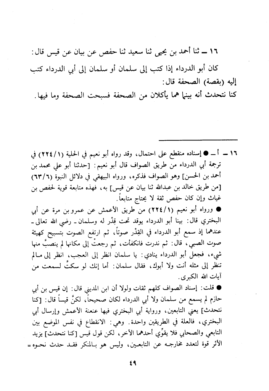 16 - ثنا أَحْمَدُ بْنُ يَحْيَى، ثنا سَعِيدٌ، ثنا حَفْصٌ، عَنْ بَيَانٍ، عَنْ قَيْسٍ قَالَ: " كَانَ §أَبُو الدَّرْدَاءِ إِذَا كَتَبَ إِلَى سَلْمَانَ أَوْ سَلْمَانُ إِلَى أَبِي الدَّرْدَاءِ، كَتَبَ إِلَيْهِ بِقِصَّةِ الصَّحْفَةِ قَالَ: كُنَّا نَتَحَدَّثُ أَنَّهُ بَيْنَمَا هُمَا يَأْكُلَانِ مِنَ الصَّحْفَةِ فَسَبَحَتِ الصَّحْفَةُ، وَمَا فِيهَا "