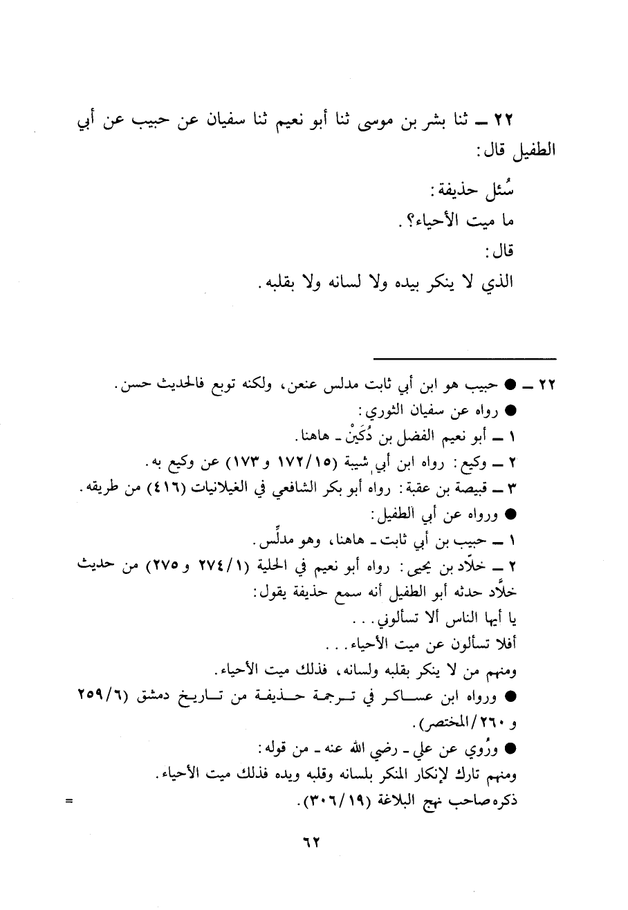 22 - ثنا بِشْرُ بْنُ مُوسَى، ثنا أَبُو نُعَيْمٍ، ثنا سُفْيَانُ، عَنْ حَبِيبٍ، عَنْ أَبِي الطُّفَيْلِ قَالَ: سُئِلَ حُذَيْفَةُ: §مَا مَيِّتُ الْأَحْيَاءِ؟ قَالَ: «الَّذِي لَا يُنْكِرُ بِيَدِهِ وَلَا لِسَانِهِ وَلَا بِقَلْبِهِ»