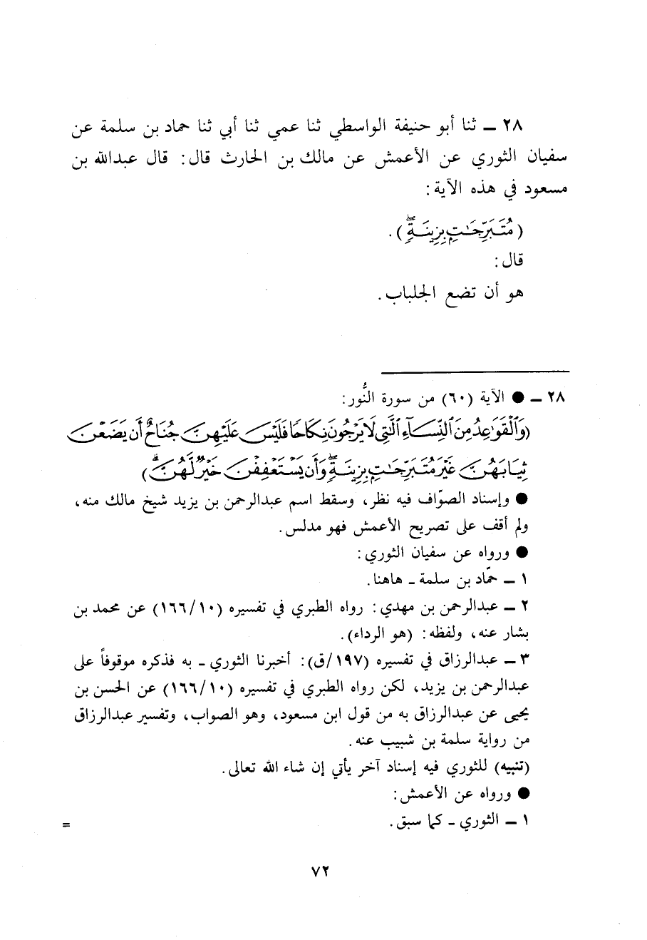 28 - ثنا أَبُو حَنِيفَةَ الْوَاسِطِيُّ، ثنا عَمِّي، ثنا أَبِي، ثنا حَمَّادُ بْنُ سَلَمَةَ، عَنْ سُفْيَانَ الثَّوْرِيِّ، عَنِ الْأَعْمَشِ، عَنْ مَالِكِ بْنِ الْحَارِثِ قَالَ: قَالَ عَبْدُ اللَّهِ بْنُ مَسْعُودٍ فِي هَذِهِ الْآيَةِ: {§مُتَبَرِّجَاتٍ بِزِينَةٍ} [النور: 60] قَالَ: «هُوَ أَنْ تَضَعَ الْجِلْبَابَ»