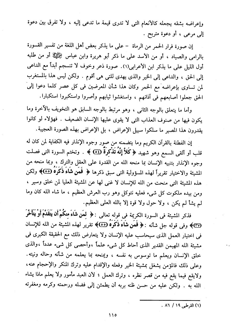 إن الفطنة بالقرآن الكريم وما يتضمنه من صور وجوه الإنذار فيه الكفاية لمن كان له قلب أو ألقى السمع وهو شهيد كَلَّا إِنَّهُ تَذْكِرَةٌ (54). وتختم السورة التى فصلت وجوه الإنذار بتنبيه الإنسان بما منحه الله من القدرة على العقل والترك، وبما منحه من المشيئة والاختيار تقريرا لهذه المسئولية التى سبق ذكرها فَمَنْ شاءَ ذَكَرَهُ (55) ولكن هذه المشيئة التى منحت من الله للإنسان لا غنى لها عن المشيئة العليا لمن خلق وسير، ومن بيده ملكوت كل شىء فعليه نتوكل وهو رب العرش العظيم، ما شاء الله كان وما لم يشأ لم يكن، ولا حول ولا قوة إلا بالله العلى العظيم.