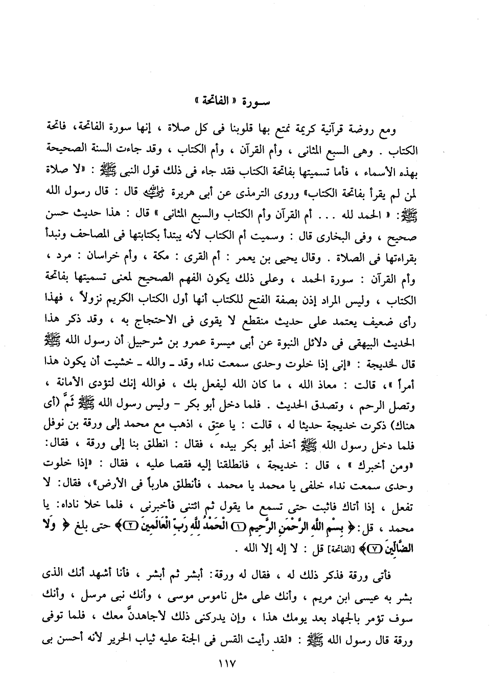 «ومن أخبرك»، قال: خديجة، فانطلقنا إليه فقصا عليه، فقال: «إذا خلوت وحدى سمعت نداء خلفى يا محمد يا محمد، فأنطلق هاربا فى الأرض»، فقال: لا تفعل، إذا أتاك فاثبت حتى تسمع ما يقول ثم ائتنى فأخبرنى، فلما خلا ناداه: يا محمد، قل: بِسْمِ اللَّهِ الرَّحْمنِ الرَّحِيمِ (1) الْحَمْدُ لِلَّهِ رَبِّ الْعالَمِينَ (2) حتى بلغ وَلَا الضَّالِّينَ (7) [الفاتحة] قل: لا إله إلا الله.