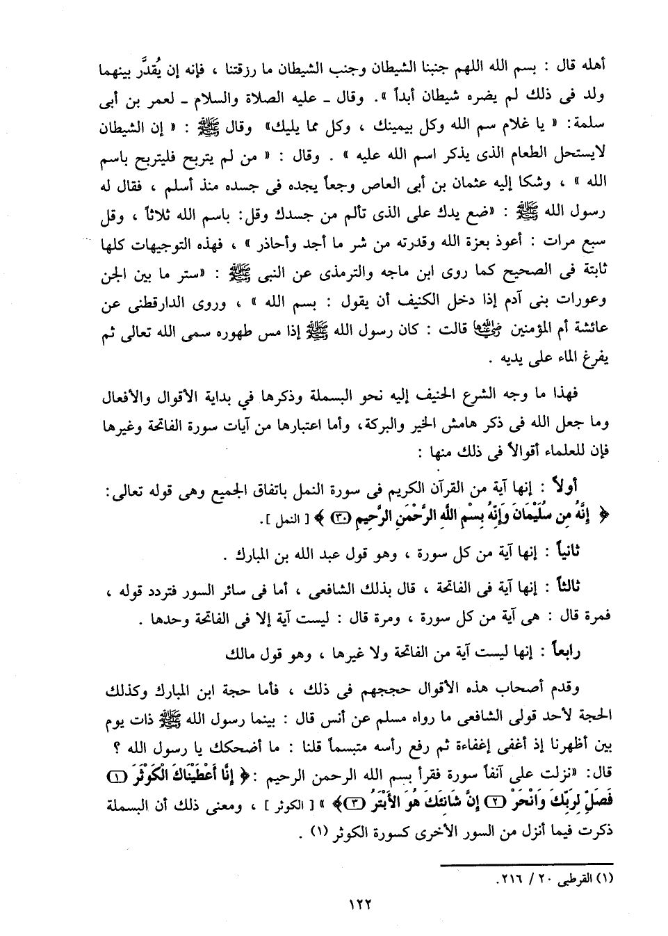 قال: «نزلت على آنفا سورة فقرأ بسم الله الرحمن الرحيم: إِنَّا أَعْطَيْناكَ الْكَوْثَرَ (1) فَصَلِّ لِرَبِّكَ وَانْحَرْ (2) إِنَّ شانِئَكَ هُوَ الْأَبْتَرُ (3)» [الكوثر]، ومعنى ذلك أن البسملة ذكرت فيما أنزل من السور الأخرى كسورة الكوثر «1».