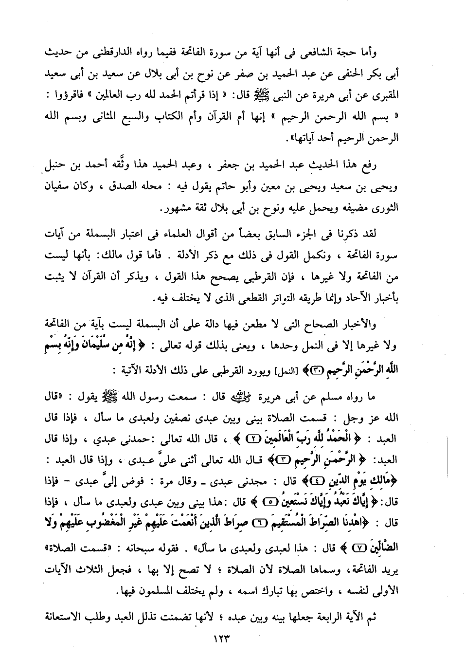 وأما حجة الشافعى فى أنها آية من سورة الفاتحة ففيما رواه الدارقطنى من حديث أبى بكر الحنفى عن عبد الحميد بن صفر عن نوح بن أبى بلال عن سعيد بن أبى سعيد المقبرى عن أبى هريرة عن النبى صلّى الله عليه وسلم قال: «إذا قرأتم الحمد لله رب العالمين» فاقرءوا: