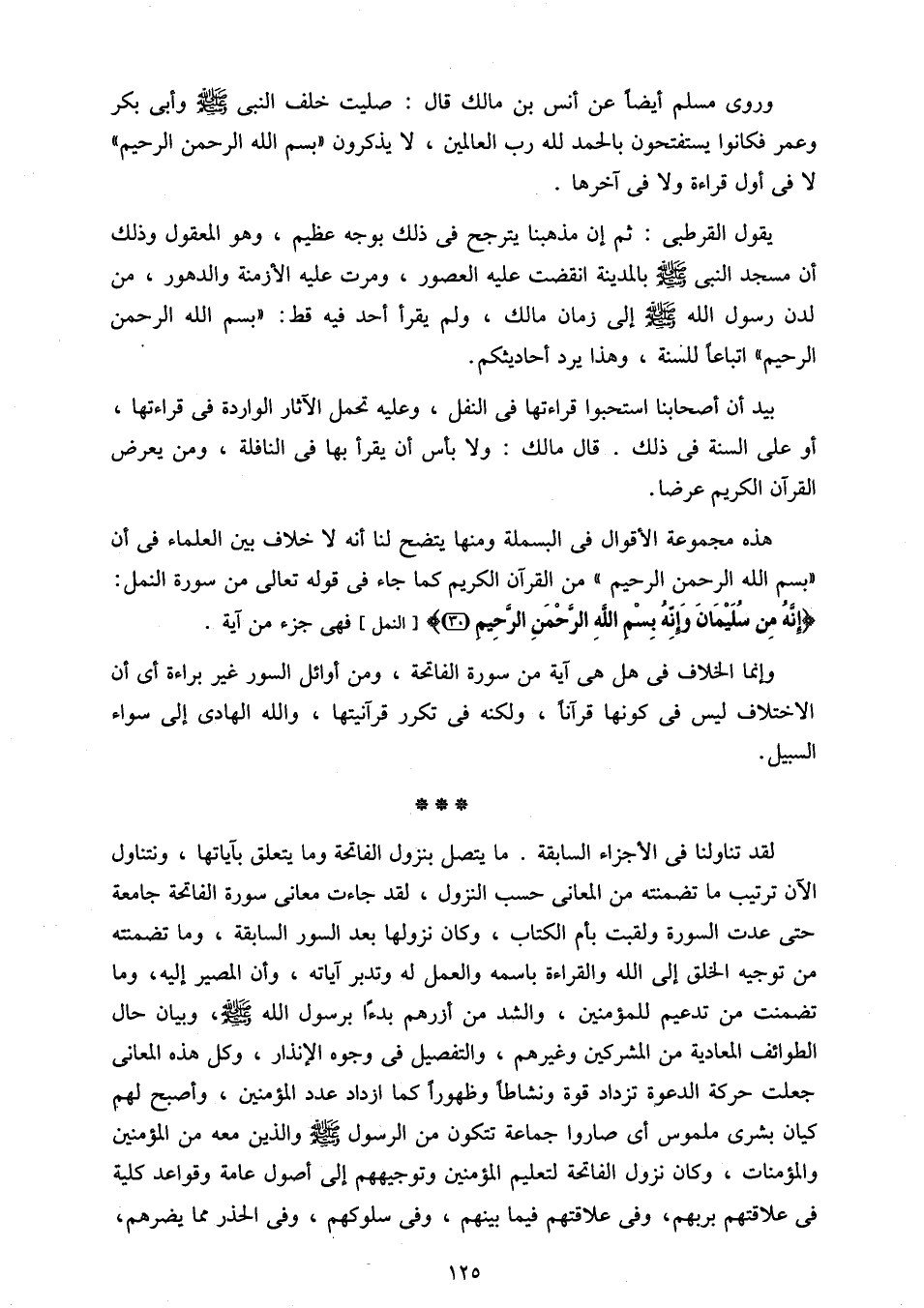 وإنما الخلاف فى هل هى آية من سورة الفاتحة، ومن أوائل السور غير براءة أى أن الاختلاف ليس فى كونها قرآنا، ولكنه فى تكرر قرآنيتها، والله الهادى إلى سواء السبيل.