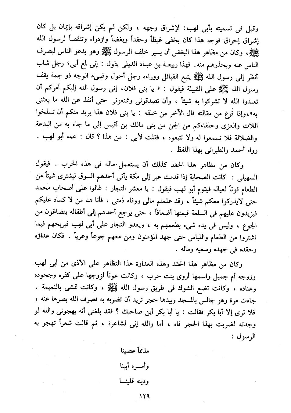 وقيل فى تسميته بأبى لهب: لإشراق وجهه، ولكن لم يكن إشراقه بإيمان بل كان إشراق إحراق فوجه هذا كان يخفى غيظا وحقدا وبغضا وازدراء وتنقصا لرسول الله صلّى الله عليه وسلم، وكان من مظاهر هذا البغض أن يسير خلف الرسول صلّى الله عليه وسلم وهو يدعو الناس ليصرف الناس عنه ويحذرهم منه. فهذا ربيعة بن عباد الديلى يقول: إنى لمع أبى؛ رجل شاب أنظر إلى رسول الله صلّى الله عليه وسلم يتبع القبائل ووراءه رجل أحول وضىء الوجه ذو جمة يقف رسول الله صلّى الله عليه وسلم على القبيلة فيقول: «يا بنى فلان، إنى رسول الله إليكم آمركم أن تعبدوا الله لا تشركوا به شيئا، وأن تصدقونى وتمنعونى حتى أنفذ عن الله ما بعثنى به»، وإذا فرغ من مقالته قال الآخر من خلفه: يا بنى فلان هذا يريد منكم أن تسلخوا اللات والعزى وحلفاءكم من الجن من بنى مالك بن أقيس إلى ما جاء به من البدعة والضلالة فلا تسمعوا له ولا تتبعوه، فقلت لأبى: من هذا؟ قال: عمه أبو لهب.