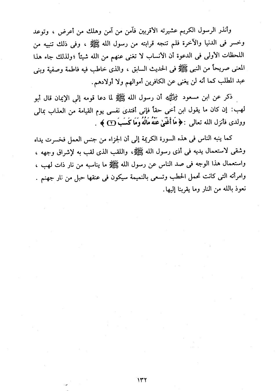 وأنذر الرسول الكريم عشيرته الأقربين فآمن من آمن وهلك من أعرض، وتوعد وخسر فى الدنيا والآخرة فلم تنجه قرابته من رسول الله صلّى الله عليه وسلم، وفى ذلك تنبيه من اللحظات الأولى فى الدعوة أن الأنساب لا تغنى عنهم من الله شيئا؛ ولذلك جاء هذا المعنى صريحا من النبى صلّى الله عليه وسلم فى الحديث السابق، والذى خاطب فيه فاطمة وصفية وبنى عبد المطلب كما أنه لن يغنى عن الكافرين أموالهم ولا أولادهم.