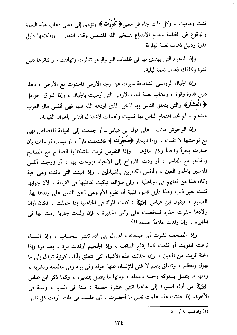 وإذا الجبال الرواسى الشامخة سيرت عن وجه الأرض فاستوت مع الأرض، وهذا دليل قدرة وقوة، وذهاب نعمة ثبات الأرض التى أرسيت بالجبال، وإذا النواق الحوامل الْعِشارُ والتى يتعلق الناس بها للخير الذى أودعه الله فيها فهى أنفس مال العرب عندهم، لم تجد اهتمام الناس بها فسيبت وأهملت لاشتغال الناس بأهوال القيامة.