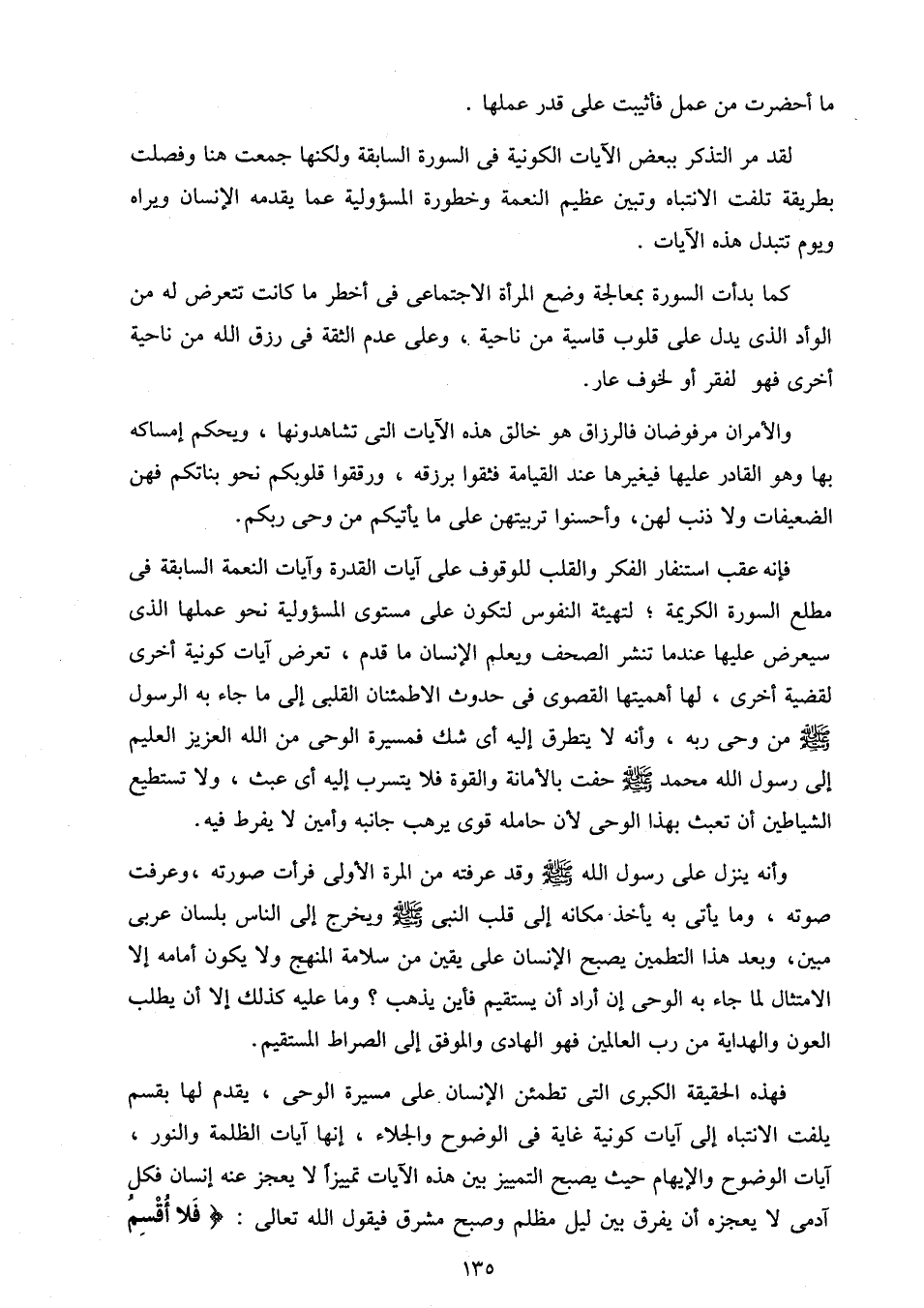 فهذه الحقيقة الكبرى التى تطمئن الإنسان على مسيرة الوحى، يقدم لها بقسم يلفت الانتباه إلى آيات كونية غاية فى الوضوح والجلاء، إنها آيات الظلمة والنور، آيات الوضوح والإيهام حيث يصبح التمييز بين هذه الآيات تمييزا لا يعجز عنه إنسان فكل آدمى لا يعجزه أن يفرق بين ليل مظلم وصبح مشرق فيقول الله تعالى: فَلا أُقْسِمُ