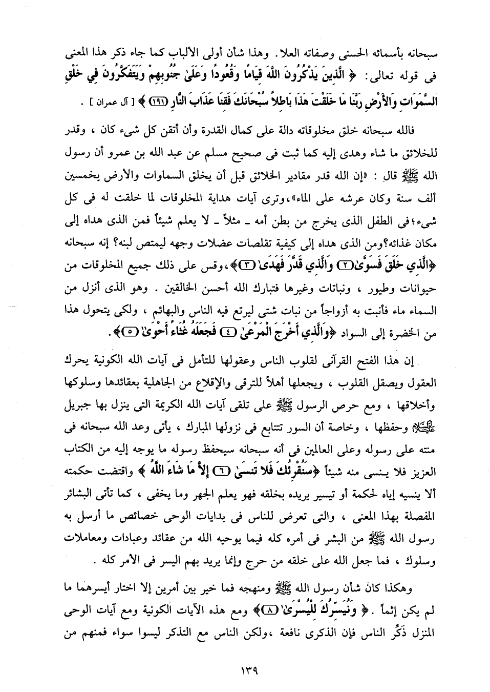 فالله سبحانه خلق مخلوقاته دالة على كمال القدرة وأن أتقن كل شىء كان، وقدر للخلائق ما شاء وهدى إليه كما ثبت فى صحيح مسلم عن عبد الله بن عمرو أن رسول الله صلّى الله عليه وسلم قال: «إن الله قدر مقادير الخلائق قبل أن يخلق السماوات والأرض بخمسين ألف سنة وكان عرشه على الماء»، وترى آيات هداية المخلوقات لما خلقت له فى كل شىء؛ فى الطفل الذى يخرج من بطن أمه- مثلا- لا يعلم شيئا فمن الذى هداه إلى مكان غذائه؟ ومن الذى هداه إلى كيفية تقلصات عضلات وجهه ليمتص لبنه؟ إنه سبحانه الَّذِي خَلَقَ فَسَوَّى (2) وَالَّذِي قَدَّرَ فَهَدى (3)، وقس على ذلك جميع المخلوقات من حيوانات وطيور، ونباتات وغيرها فتبارك الله أحسن الخالقين. وهو الذى أنزل من السماء ماء فأنبت به أزواجا من نبات شتى ليرتع فيه الناس والبهائم، ولكى يتحول هذا من الخضرة إلى السواد وَالَّذِي أَخْرَجَ الْمَرْعى (4) فَجَعَلَهُ غُثاءً أَحْوى (5).