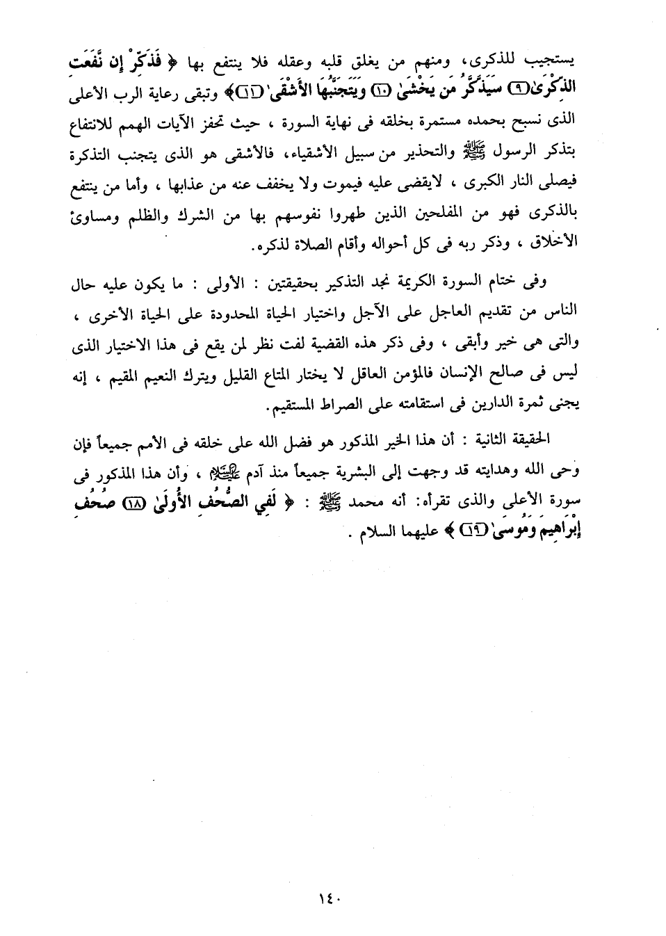 يستجيب للذكرى، ومنهم من يغلق قلبه وعقله فلا ينتفع بها فَذَكِّرْ إِنْ نَفَعَتِ الذِّكْرى (9) سَيَذَّكَّرُ مَنْ يَخْشى (10) وَيَتَجَنَّبُهَا الْأَشْقَى (11) وتبقى رعاية الرب الأعلى الذى نسبح بحمده مستمرة بخلقه فى نهاية السورة، حيث تحفز الآيات الهمم للانتفاع بتذكر الرسول صلّى الله عليه وسلم والتحذير من سبيل الأشقياء، فالأشقى هو الذى يتجنب التذكرة فيصلى النار الكبرى، لا يقضى عليه فيموت ولا يخفف عنه من عذابها، وأما من ينتفع بالذكرى فهو من المفلحين الذين طهروا نفوسهم بها من الشرك والظلم ومساوئ الأخلاق، وذكر ربه فى كل أحواله وأقام الصلاة لذكره.