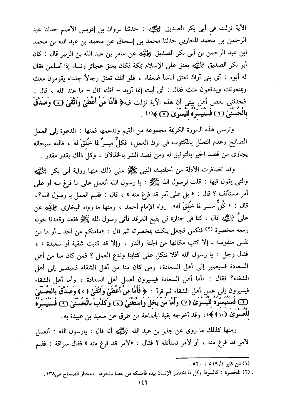 وقد تضافرت الأدلة من أحاديث النبى صلّى الله عليه وسلم على ذلك منها رواية أبى بكر رضي الله عنه والتى يقول فيها: قلت لرسول الله صلّى الله عليه وسلم: يا رسول الله أنعمل على ما فرغ منه أو على أمر مستأنف؟ قال: «بل على أمر قد فرغ منه»، قال: ففيم العمل يا رسول الله؟، قال: «كلّ ميسر لما خلق له». رواه الإمام أحمد، ومنها ما رواه البخارى رضي الله عنه عن علىّ رضي الله عنه قال: كنا فى جنازة فى بقيع الغرقد فأتى رسول الله صلّى الله عليه وسلم فقعد وقعدنا حوله ومعه مخصرة «2» فنكس فجعل ينكت بمخصرته ثم قال: «ما منكم من أحد- أو ما من نفس منفوسة- إلا كتب مكانها من الجنة والنار، وإلا قد كتبت شقية أو سعيدة»، فقال رجل: يا رسول الله أفلا نتكل على كتابنا وندع العمل؟ فمن كان منا من أهل السعادة فسيصير إلى أهل السعادة، ومن كان منا من أهل الشقاء فسيصير إلى أهل الشقاء؟ فقال: «أما أهل السعادة فيسيرون لعمل أهل السعادة، وأما أهل الشقاء فيسيرون إلى عمل أهل الشقاء ثم قرأ: فَأَمَّا مَنْ أَعْطى وَاتَّقى (5) وَصَدَّقَ بِالْحُسْنى (6) فَسَنُيَسِّرُهُ لِلْيُسْرى (7) وَأَمَّا مَنْ بَخِلَ وَاسْتَغْنى (8) وَكَذَّبَ بِالْحُسْنى (9) فَسَنُيَسِّرُهُ لِلْعُسْرى (10)، وقد أخرجه بقية الجماعة من طرق عن سعيد بن عبيدة به.