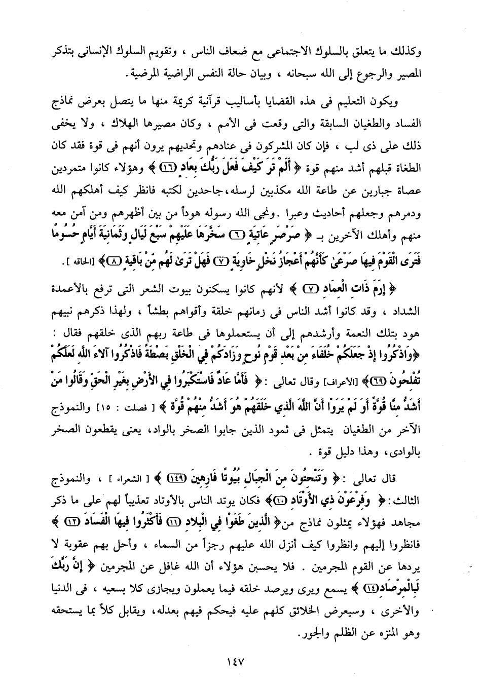 ويكون التعليم فى هذه القضايا بأساليب قرآنية كريمة منها ما يتصل بعرض نماذج الفساد والطغيان السابقة والتى وقعت فى الأمم، وكان مصيرها الهلاك، ولا يخفى ذلك على ذى لب، فإن كان المشركون فى عنادهم وتحديهم يرون أنهم فى قوة فقد كان الطغاة قبلهم أشد منهم قوة أَلَمْ تَرَ كَيْفَ فَعَلَ رَبُّكَ بِعادٍ (16) وهؤلاء كانوا متمردين عصاة جبارين عن طاعة الله مكذبين لرسله، جاحدين لكتبه فانظر كيف أهلكهم الله ودمرهم وجعلهم أحاديث وعبرا. ونجى الله رسوله هودا من بين أظهرهم ومن آمن معه منهم وأهلك الآخرين ب صَرْصَرٍ عاتِيَةٍ (6) سَخَّرَها عَلَيْهِمْ سَبْعَ لَيالٍ وَثَمانِيَةَ أَيَّامٍ حُسُوماً فَتَرَى الْقَوْمَ فِيها صَرْعى كَأَنَّهُمْ أَعْجازُ نَخْلٍ خاوِيَةٍ (7) فَهَلْ تَرى لَهُمْ مِنْ باقِيَةٍ (8) [الحاقه].