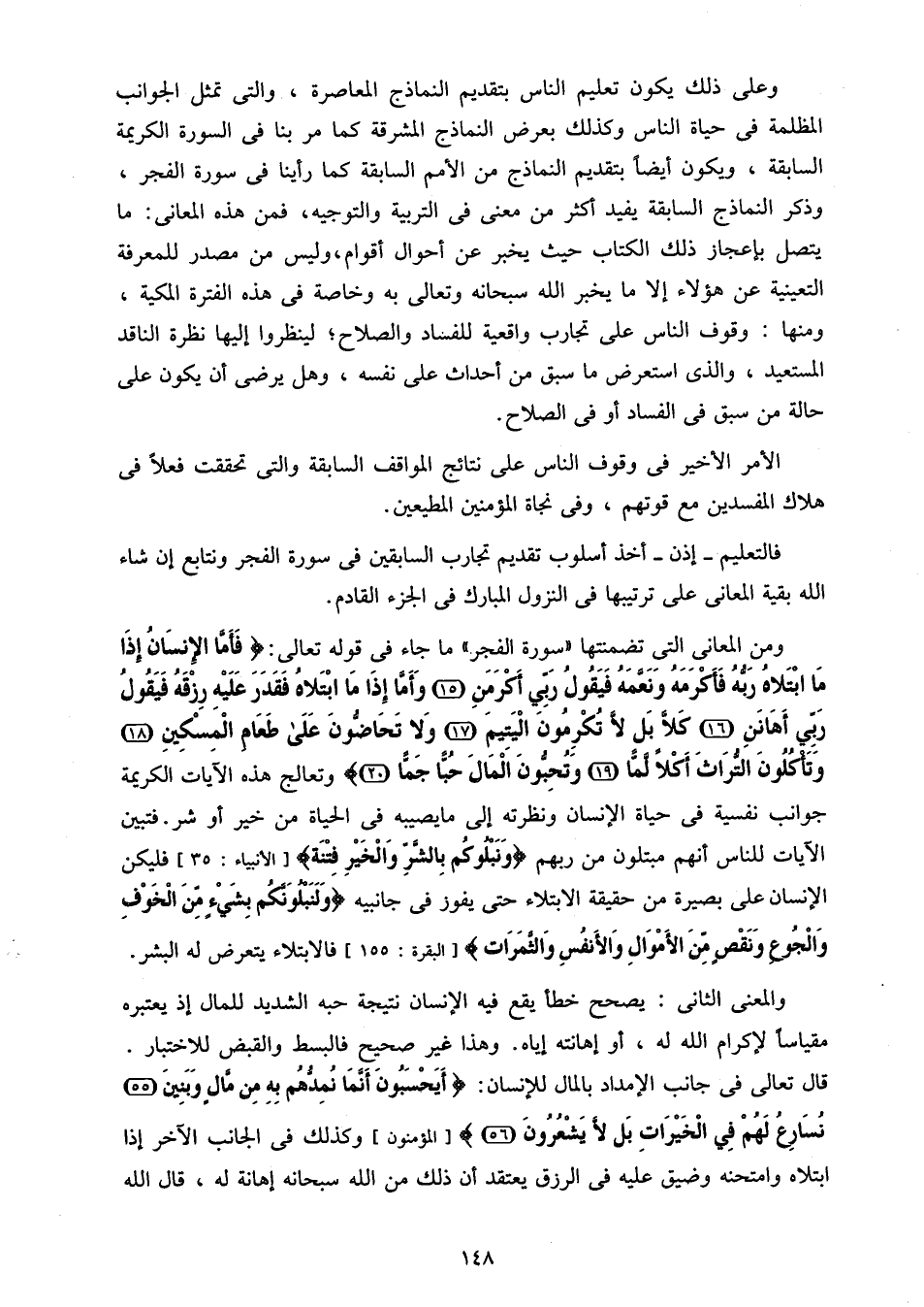 ومن المعانى التى تضمنتها «سورة الفجر» ما جاء فى قوله تعالى: فَأَمَّا الْإِنْسانُ إِذا مَا ابْتَلاهُ رَبُّهُ فَأَكْرَمَهُ وَنَعَّمَهُ فَيَقُولُ رَبِّي أَكْرَمَنِ (15) وَأَمَّا إِذا مَا ابْتَلاهُ فَقَدَرَ عَلَيْهِ رِزْقَهُ فَيَقُولُ رَبِّي أَهانَنِ (16) كَلَّا بَلْ لا تُكْرِمُونَ الْيَتِيمَ (17) وَلا تَحَاضُّونَ عَلى طَعامِ الْمِسْكِينِ (18) وَتَأْكُلُونَ التُّراثَ أَكْلًا لَمًّا (19) وَتُحِبُّونَ الْمالَ حُبًّا جَمًّا (20) وتعالج هذه الآيات الكريمة جوانب نفسية فى حياة الإنسان ونظرته إلى ما يصيبه فى الحياة من خير أو شر. فتبين الآيات للناس أنهم مبتلون من ربهم وَنَبْلُوكُمْ بِالشَّرِّ وَالْخَيْرِ فِتْنَةً [الأنبياء: 35] فليكن الإنسان على بصيرة من حقيقة الابتلاء حتى يفوز فى جانبيه وَلَنَبْلُوَنَّكُمْ بِشَيْءٍ مِنَ الْخَوْفِ وَالْجُوعِ وَنَقْصٍ مِنَ الْأَمْوالِ وَالْأَنْفُسِ وَالثَّمَراتِ [البقرة: