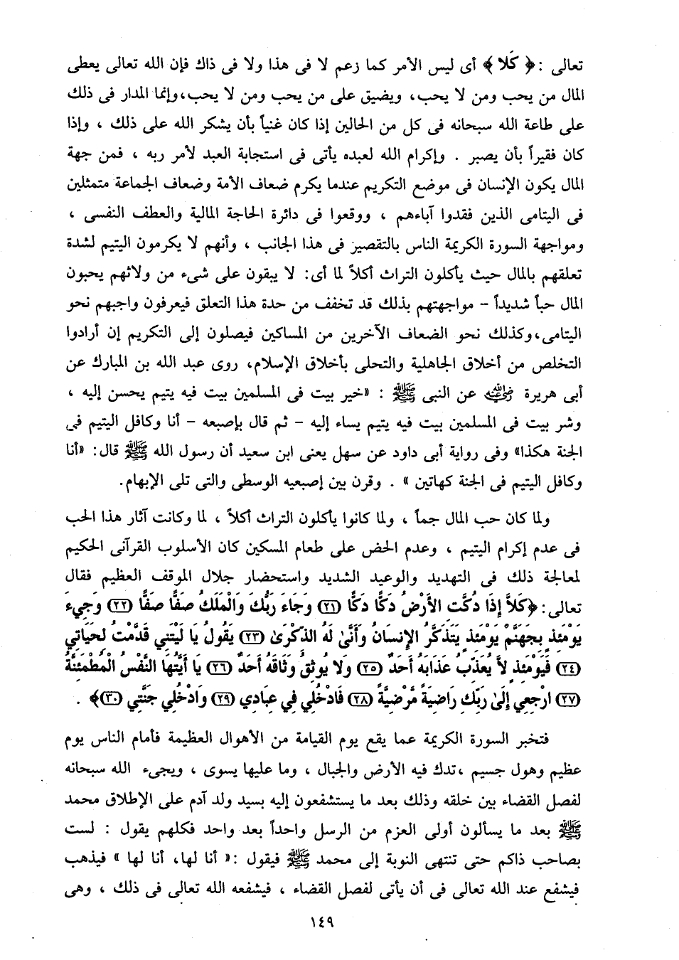 ولما كان حب المال جما، ولما كانوا يأكلون التراث أكلا، لما وكانت آثار هذا الحب فى عدم إكرام اليتيم، وعدم الحض على طعام المسكين كان الأسلوب القرآنى الحكيم لمعالجة ذلك فى التهديد والوعيد الشديد واستحضار جلال الموقف العظيم فقال تعالى: كَلَّا إِذا دُكَّتِ الْأَرْضُ دَكًّا دَكًّا (21) وَجاءَ رَبُّكَ وَالْمَلَكُ صَفًّا صَفًّا (22) وَجِيءَ يَوْمَئِذٍ بِجَهَنَّمَ يَوْمَئِذٍ يَتَذَكَّرُ الْإِنْسانُ وَأَنَّى لَهُ الذِّكْرى (23) يَقُولُ يا لَيْتَنِي قَدَّمْتُ لِحَياتِي (24) فَيَوْمَئِذٍ لا يُعَذِّبُ عَذابَهُ أَحَدٌ (25) وَلا يُوثِقُ وَثاقَهُ أَحَدٌ (26) يا أَيَّتُهَا النَّفْسُ الْمُطْمَئِنَّةُ (27) ارْجِعِي إِلى رَبِّكِ راضِيَةً مَرْضِيَّةً (28) فَادْخُلِي فِي عِبادِي (29) وَادْخُلِي جَنَّتِي (30).