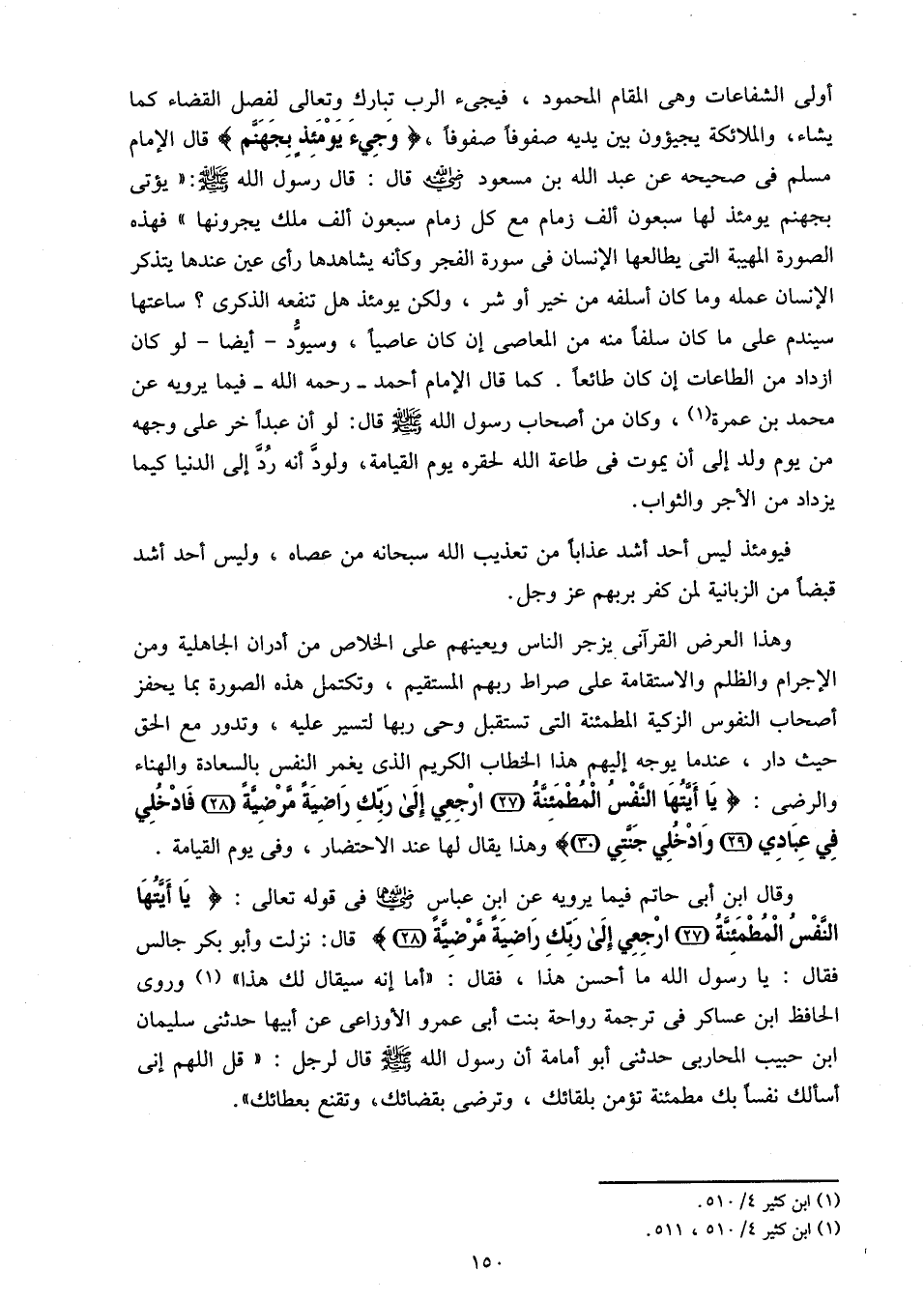 وهذا العرض القرآنى يزجر الناس ويعينهم على الخلاص من أدران الجاهلية ومن الإجرام والظلم والاستقامة على صراط ربهم المستقيم، وتكتمل هذه الصورة بما يحفز أصحاب النفوس الزكية المطمئنة التى تستقبل وحى ربها لتسير عليه، وتدور مع الحق حيث دار، عند ما يوجه إليهم هذا الخطاب الكريم الذى يغمر النفس بالسعادة والهناء والرضى: يا أَيَّتُهَا النَّفْسُ الْمُطْمَئِنَّةُ (27) ارْجِعِي إِلى رَبِّكِ راضِيَةً مَرْضِيَّةً (28) فَادْخُلِي فِي عِبادِي (29) وَادْخُلِي جَنَّتِي (30) وهذا يقال لها عند الاحتضار، وفى يوم القيامة.