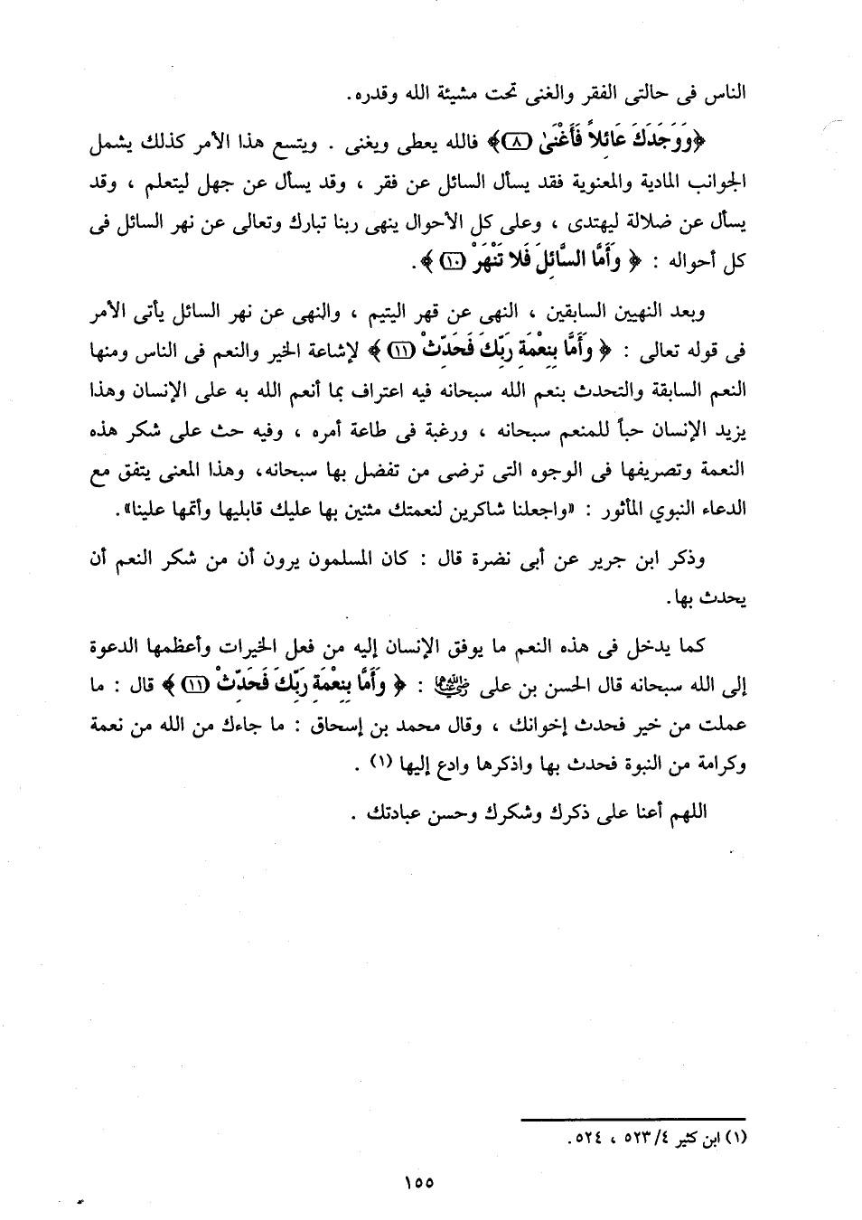 وبعد النهيين السابقين، النهى عن قهر اليتيم، والنهى عن نهر السائل يأتى الأمر فى قوله تعالى: وَأَمَّا بِنِعْمَةِ رَبِّكَ فَحَدِّثْ (11) لإشاعة الخير والنعم فى الناس ومنها النعم السابقة والتحدث بنعم الله سبحانه فيه اعتراف بما أنعم الله به على الإنسان وهذا يزيد الإنسان حبا للمنعم سبحانه، ورغبة فى طاعة أمره، وفيه حث على شكر هذه النعمة وتصريفها فى الوجوه التى ترضى من تفضل بها سبحانه، وهذا المعنى يتفق مع الدعاء النبوي المأثور: «واجعلنا شاكرين لنعمتك مثنين بها عليك قابليها وأتمها علينا».
