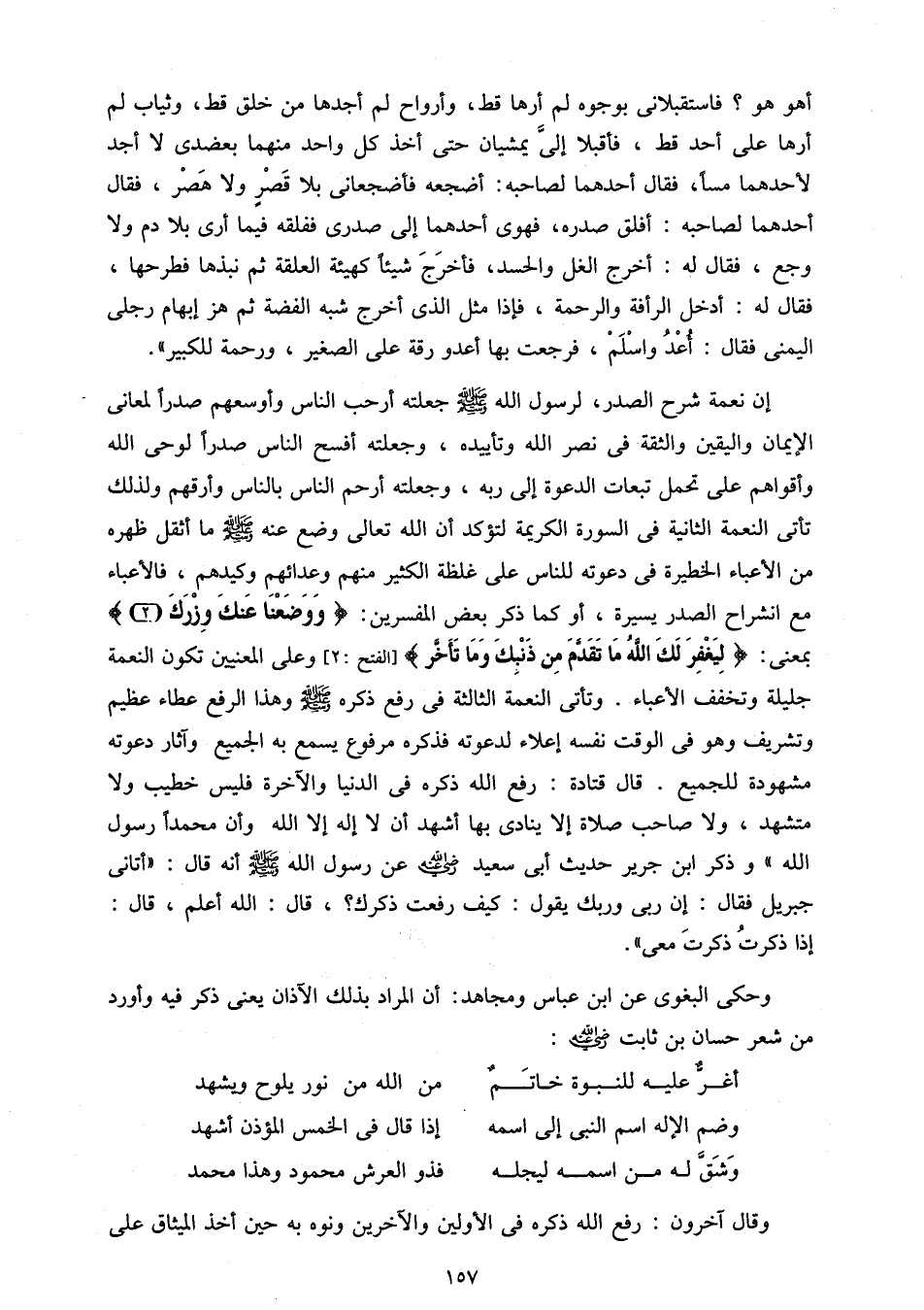 إن نعمة شرح الصدر، لرسول الله صلّى الله عليه وسلم جعلته أرحب الناس وأوسعهم صدرا لمعانى الإيمان واليقين والثقة فى نصر الله وتأييده، وجعلته أفسح الناس صدرا لوحى الله وأقواهم على تحمل تبعات الدعوة إلى ربه، وجعلته أرحم الناس بالناس وأرقهم ولذلك تأتى النعمة الثانية فى السورة الكريمة لتؤكد أن الله تعالى وضع عنه صلّى الله عليه وسلم ما أثقل ظهره من الأعباء الخطيرة فى دعوته للناس على غلظة الكثير منهم وعدائهم وكيدهم، فالأعباء مع انشراح الصدر يسيرة، أو كما ذكر بعض المفسرين: وَوَضَعْنا عَنْكَ وِزْرَكَ (2) بمعنى: لِيَغْفِرَ لَكَ اللَّهُ ما تَقَدَّمَ مِنْ ذَنْبِكَ وَما تَأَخَّرَ [الفتح: 2] وعلى المعنيين تكون النعمة جليلة وتخفف الأعباء. وتأتى النعمة الثالثة فى رفع ذكره صلّى الله عليه وسلم وهذا الرفع عطاء عظيم وتشريف وهو فى الوقت نفسه إعلاء لدعوته فذكره مرفوع يسمع به الجميع وآثار دعوته مشهودة للجميع. قال قتادة: رفع الله ذكره فى الدنيا والآخرة فليس خطيب ولا متشهد، ولا صاحب صلاة إلا ينادى بها أشهد أن لا إله إلا الله وأن محمدا رسول الله» وذكر ابن جرير حديث أبى سعيد رضي الله عنه عن رسول الله صلّى الله عليه وسلم أنه قال: «أتانى جبريل فقال: إن ربى وربك يقول: كيف رفعت ذكرك؟، قال: الله أعلم، قال: