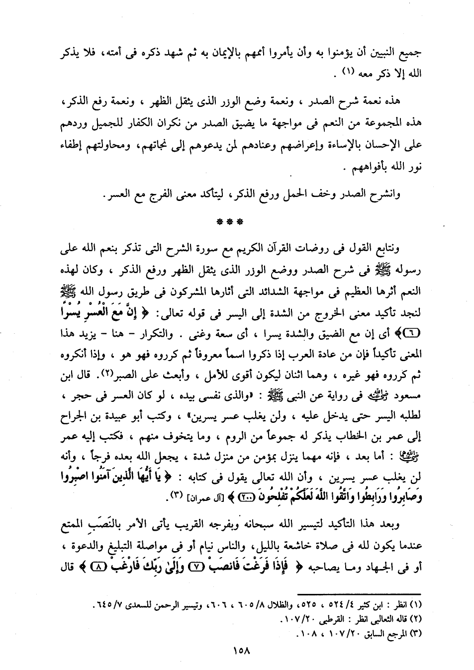 ونتابع القول فى روضات القرآن الكريم مع سورة الشرح التى تذكر بنعم الله على رسوله صلّى الله عليه وسلم فى شرح الصدر ووضع الوزر الذى يثقل الظهر ورفع الذكر، وكان لهذه النعم أثرها العظيم فى مواجهة الشدائد التى أثارها المشركون فى طريق رسول الله صلّى الله عليه وسلم لنجد تأكيد معنى الخروج من الشدة إلى اليسر فى قوله تعالى: إِنَّ مَعَ الْعُسْرِ يُسْراً (6) أى إن مع الضيق والشدة يسرا، أى سعة وغنى. والتكرار- هنا- يزيد هذا المعنى تأكيدا فإن من عادة العرب إذا ذكروا اسما معروفا ثم كرروه فهو هو، وإذا أنكروه ثم كرروه فهو غيره، وهما اثنان ليكون أقوى للأمل، وأبعث على الصبر «2». قال ابن مسعود رضي الله عنه فى رواية عن النبى صلّى الله