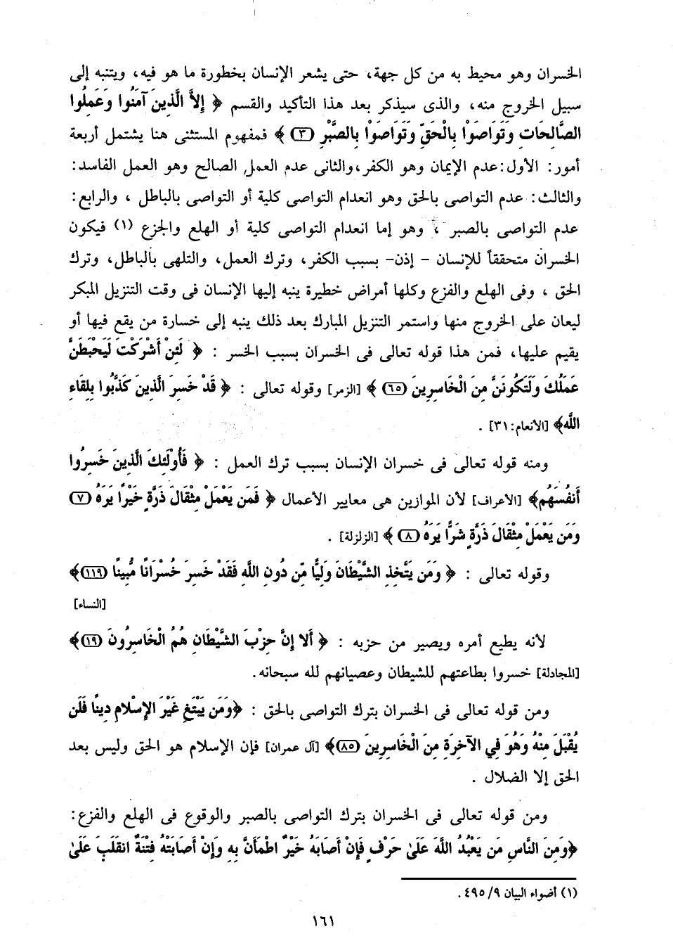 عدم التواصى بالصبر، وهو إما انعدام التواصى كلية أو الهلع والجزع «1» فيكون الخسران متحققا للإنسان- إذن- بسبب الكفر، وترك العمل، والتلهى بالباطل، وترك الحق، وفى الهلع والفزع وكلها أمراض خطيرة ينبه إليها الإنسان فى وقت التنزيل المبكر ليعان على الخروج منها واستمر التنزيل المبارك بعد ذلك ينبه إلى خسارة من يقع فيها أو يقيم عليها، فمن هذا قوله تعالى فى الخسران بسبب الخسر: لَئِنْ أَشْرَكْتَ لَيَحْبَطَنَّ عَمَلُكَ وَلَتَكُونَنَّ مِنَ الْخاسِرِينَ (65) [الزمر] وقوله تعالى: قَدْ خَسِرَ الَّذِينَ كَذَّبُوا بِلِقاءِ اللَّهِ [الأنعام: 31].