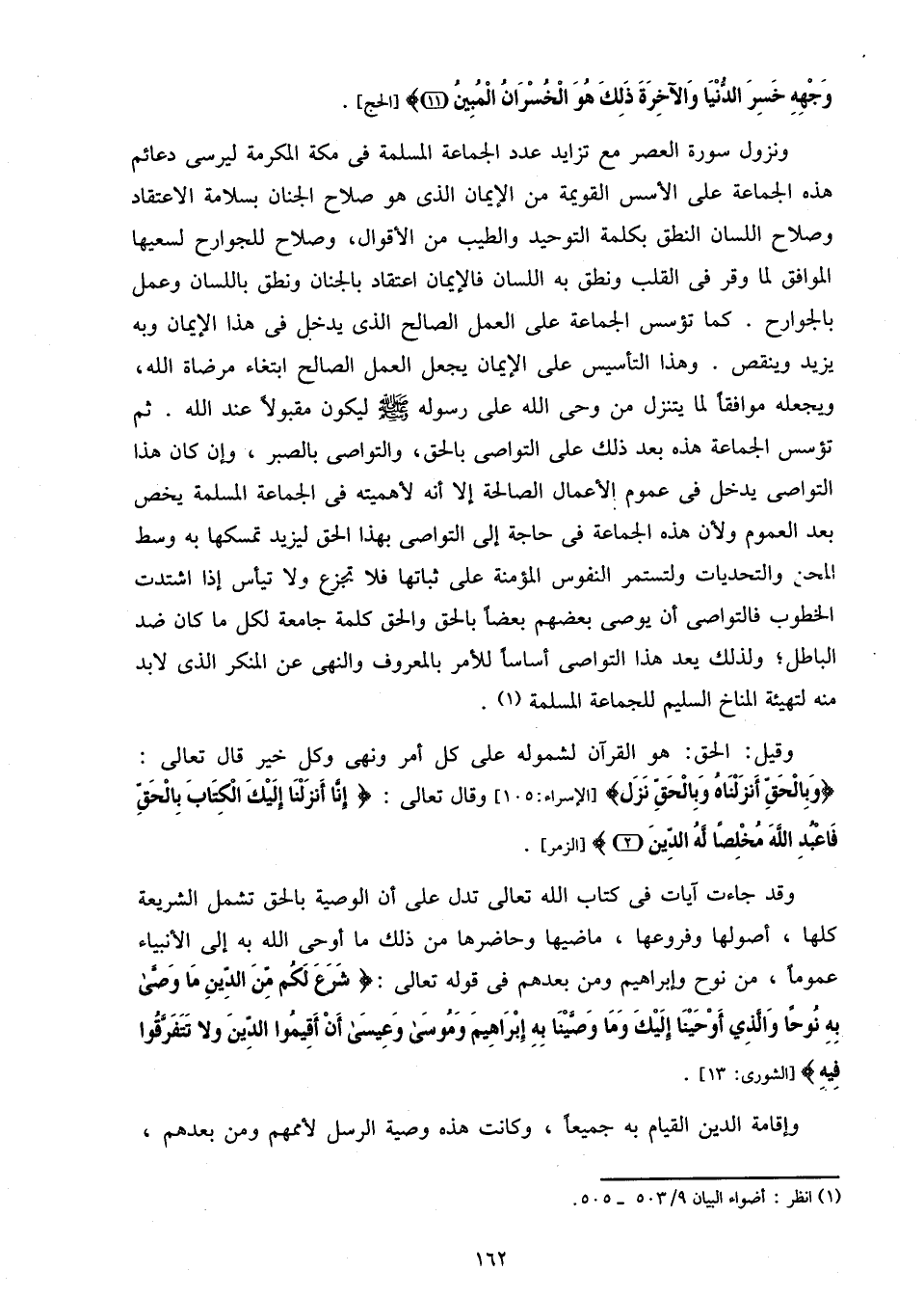 ونزول سورة العصر مع تزايد عدد الجماعة المسلمة فى مكة المكرمة ليرسى دعائم هذه الجماعة على الأسس القويمة من الإيمان الذى هو صلاح الجنان بسلامة الاعتقاد وصلاح اللسان النطق بكلمة التوحيد والطيب من الأقوال، وصلاح للجوارح لسعيها الموافق لما وقر فى القلب ونطق به اللسان فالإيمان اعتقاد بالجنان ونطق باللسان وعمل بالجوارح. كما تؤسس الجماعة على العمل الصالح الذى يدخل فى هذا الإيمان وبه يزيد وينقص. وهذا التأسيس على الإيمان يجعل العمل الصالح ابتغاء مرضاة الله، ويجعله موافقا لما يتنزل من وحى الله على رسوله صلّى الله عليه وسلم ليكون مقبولا عند الله. ثم تؤسس الجماعة هذه بعد ذلك على التواصى بالحق، والتواصى بالصبر، وإن كان هذا التواصى يدخل فى عموم الأعمال الصالحة إلا أنه لأهميته فى الجماعة المسلمة يخص بعد العموم ولأن هذه الجماعة فى حاجة إلى التواصى بهذا الحق ليزيد تمسكها به وسط المحن والتحديات ولتستمر النفوس المؤمنة على ثباتها فلا تجزع ولا تيأس إذا اشتدت الخطوب فالتواصى أن يوصى بعضهم بعضا بالحق والحق كلمة جامعة لكل ما كان ضد الباطل؛ ولذلك يعد هذا التواصى أساسا للأمر بالمعروف والنهى عن المنكر الذى لا بدّ منه لتهيئة المناخ السليم للجماعة المسلمة «1».