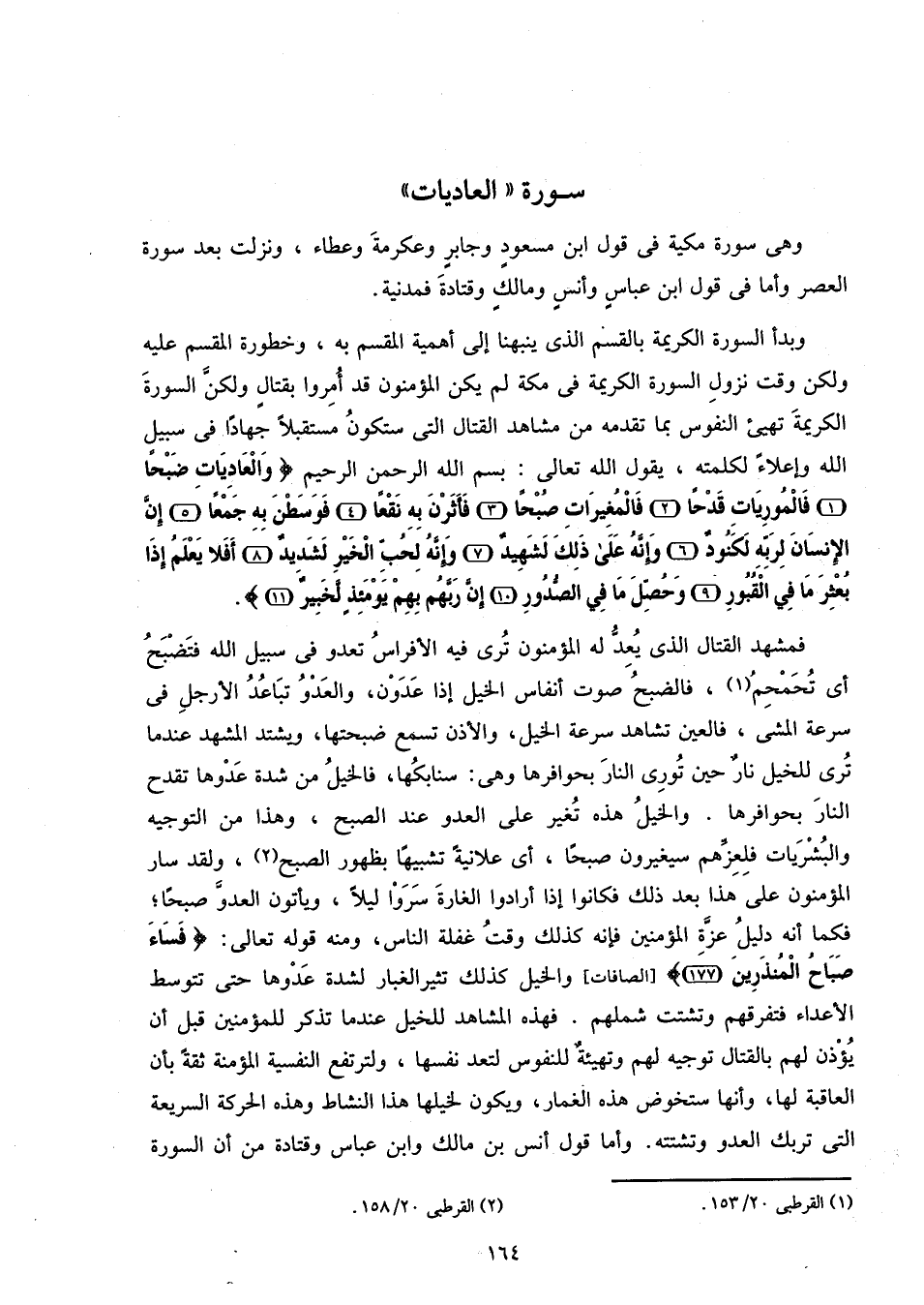 فمشهد القتال الذى يعدّ له المؤمنون ترى فيه الأفراس تعدو فى سبيل الله فتضبح أى تحمحم «1»، فالضبح صوت أنفاس الخيل إذا عدون، والعدو تباعد الأرجل فى سرعة المشى، فالعين تشاهد سرعة الخيل، والأذن تسمع ضبحتها، ويشتد المشهد عند ما ترى للخيل نار حين تورى النار بحوافرها وهى: سنابكها، فالخيل من شدة عدوها تقدح النار بحوافرها. والخيل هذه تغير على العدو عند الصبح، وهذا من التوجيه والبشريات فلعزّهم سيغيرون صبحا، أى علانية تشبيها بظهور الصبح «2»، ولقد سار المؤمنون على هذا بعد ذلك فكانوا إذا أرادوا الغارة سروا ليلا، ويأتون العدوّ صبحا؛ فكما أنه دليل عزّة المؤمنين فإنه كذلك وقت غفلة الناس، ومنه قوله تعالى: فَساءَ صَباحُ الْمُنْذَرِينَ (177) [الصافات] والخيل كذلك تثير الغبار لشدة عدوها حتى تتوسط الأعداء فتفرقهم وتشتت شملهم. فهذه المشاهد للخيل عند ما تذكر للمؤمنين قبل أن يؤذن لهم بالقتال توجيه لهم وتهيئة للنفوس لتعد نفسها، ولترتفع النفسية المؤمنة ثقة بأن العاقبة لها، وأنها ستخوض هذه الغمار، ويكون لخيلها هذا النشاط وهذه الحركة السريعة التى تربك العدو وتشتته. وأما قول أنس بن مالك وابن عباس وقتادة من أن السورة