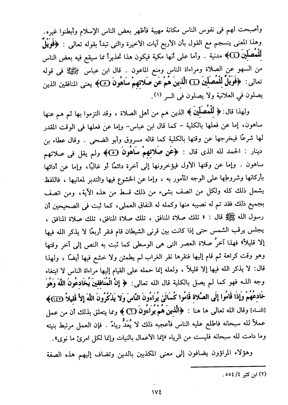 ولهذا قال: لِلْمُصَلِّينَ الذين هم من أهل الصلاة، وقد التزموا بها ثم هم عنها ساهون، إما عن فعلها بالكلية- كما قال ابن عباس- وإما عن فعلها فى الوقت المقدر لها شرعا فيخرجها عن وقتها بالكلية كما قاله مسروق وأبو الضحى. وقال عطاء بن دينار: الحمد لله الذى قال: عَنْ صَلاتِهِمْ ساهُونَ (5) ولم يقل فى صلاتهم ساهون. وإما عن وقتها الأول فيؤخرونها إلى آخرة دائما أو غالبا، وإما عن أدائها بأركانها وشروطها على الوجه المأمور به، وإما عن الخشوع فيها والتدبر لمعانيها، فاللفظ يشمل ذلك كله ولكل من اتصف بشيء من ذلك قسط من هذه الآية، ومن اتصف بجميع ذلك فقد تم له نصيبه منها وكمله له النفاق العملى، كما ثبت فى الصحيحين أن رسول الله صلّى الله عليه وسلم قال: «تلك صلاة المنافق، تلك صلاة المنافق، تلك صلاة المنافق، يجلس يرقب الشمس حتى إذا كانت بين قرنى الشيطان قام فنقر أربعا لا يذكر الله فيها إلا قليلا» فهذا آخر صلاة العصر التى هى الوسطى كما ثبت به النص إلى آخر وقتها وهو وقت كراهة ثم قام إليها فنقرها نقر الغراب لم يطمئن ولا خشع فيها أيضا، ولهذا قال: لا يذكر الله فيها إلا قليلا، ولعله إنما حمله على القيام إليها مراءاة الناس لا ابتغاء وجه الله فهو كما لم يصل بالكلية قال الله تعالى: إِنَّ الْمُنافِقِينَ يُخادِعُونَ اللَّهَ وَهُوَ خادِعُهُمْ وَإِذا قامُوا إِلَى الصَّلاةِ قامُوا كُسالى يُراؤُنَ النَّاسَ وَلا يَذْكُرُونَ اللَّهَ إِلَّا قَلِيلًا (143) [النساء] وقال الله تعالى هاهنا: الَّذِينَ هُمْ يُراؤُنَ (6) ومما يتعلق بذلك أن من عمل عملا لله سبحانه فاطلع عليه الناس فأعجبه ذلك لا يعدّ رياء. فإن العمل مرتبط بنيته وما دامت لله سبحانه فليست من الرياء «إنما الأعمال بالنيات وإنما لكل امرئ ما نوى».