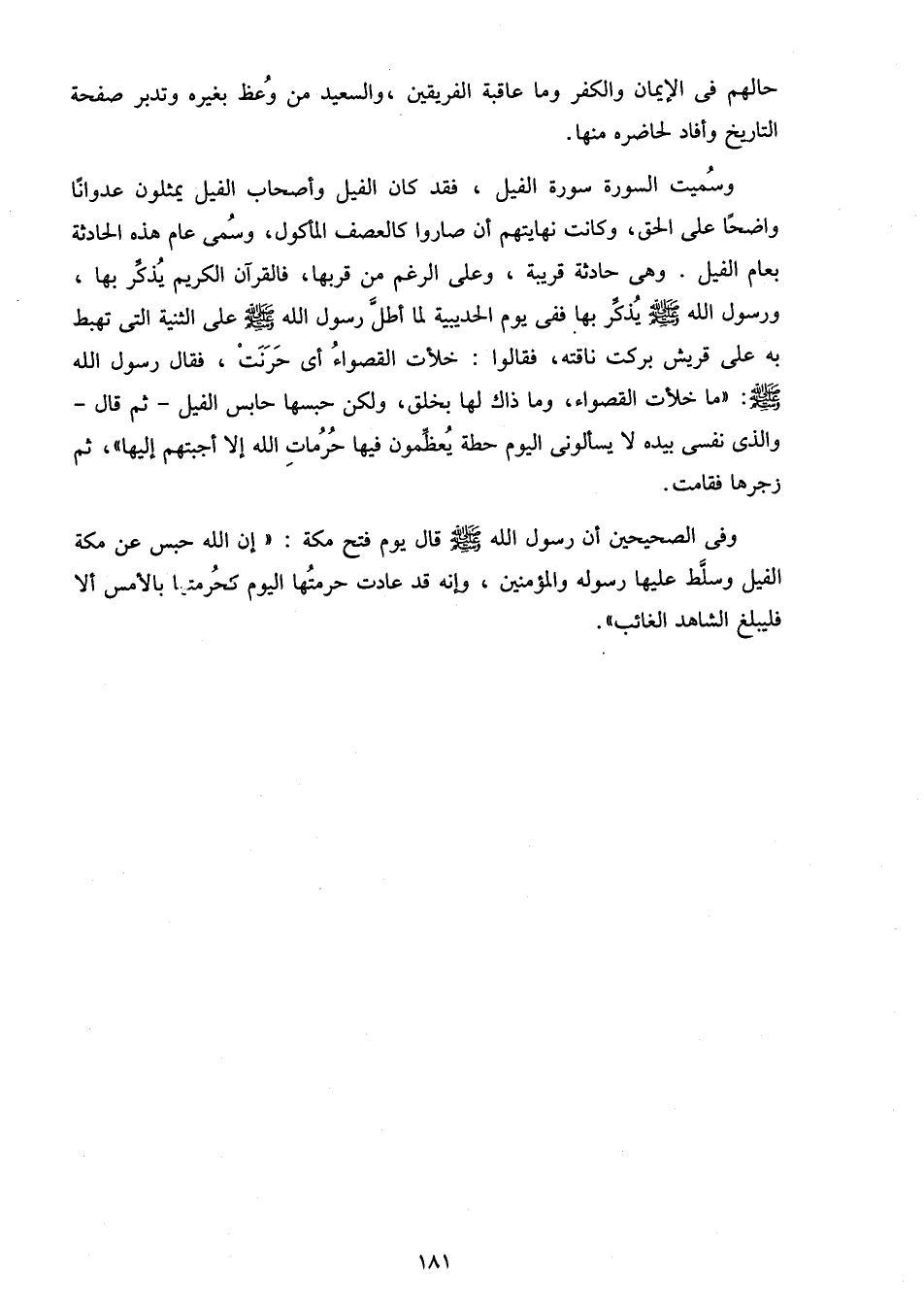 وفى الصحيحين أن رسول الله صلّى الله عليه وسلم قال يوم فتح مكة: «إن الله حبس عن مكة الفيل وسلّط عليها رسوله والمؤمنين، وإنه قد عادت حرمتها اليوم كحرمتها بالأمس ألا فليبلغ الشاهد الغائب».