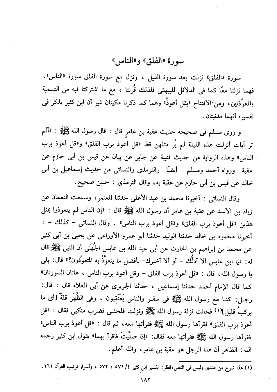 وروى مسلم فى صحيحه حديث عقبة بن عامر قال: قال رسول الله صلّى الله عليه وسلم: «ألم تر آيات أنزلت هذه الليلة لم ير مثلهن قط «قل أعوذ برب الفلق» و «قل أعوذ برب الناس» وهذه الرواية من حديث قتيبة عن جابر عن بيان عن قيس بن أبى حازم عن عقبة. ورواه أحمد ومسلم- أيضا- والترمذى والنسائى من حديث إسماعيل بن أبى خالد عن قيس بن أبى حازم عن عقبة به، وقال الترمذى: حسن صحيح.