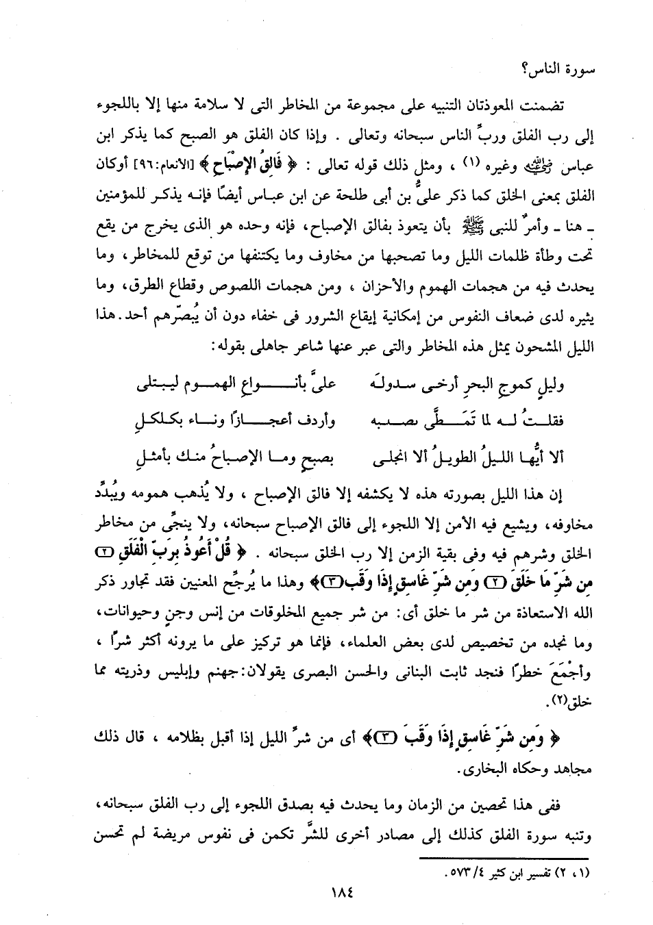 إن هذا الليل بصورته هذه لا يكشفه إلا فالق الإصباح، ولا يذهب همومه ويبدّد مخاوفه، ويشيع فيه الأمن إلا اللجوء إلى فالق الإصباح سبحانه، ولا ينجّى من مخاطر الخلق وشرهم فيه وفى بقية الزمن إلا رب الخلق سبحانه. قُلْ أَعُوذُ بِرَبِّ الْفَلَقِ (1) مِنْ شَرِّ ما خَلَقَ (2) وَمِنْ شَرِّ غاسِقٍ إِذا وَقَبَ (3) وهذا ما يرجّح المعنيين فقد تجاور ذكر الله الاستعاذة من شر ما خلق أى: من شر جميع المخلوقات من إنس وجن وحيوانات، وما نجده من تخصيص لدى بعض العلماء، فإنما هو تركيز على ما يرونه أكثر شرّا، وأجمع خطرا فنجد ثابت البنانى والحسن البصرى يقولان: جهنم وإبليس وذريته مما خلق «1».