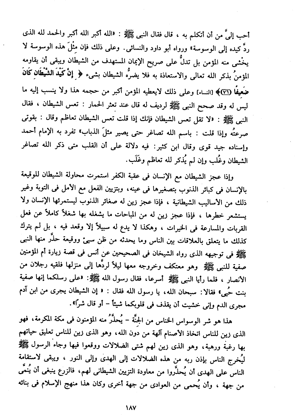 فعل القربات والمسارعة فى الخيرات، وهكذا لا يدع له سبيلا إلا وقعد فيه، بل لم يترك كذلك ما يتعلق بالعلاقات بين الناس وما يحدثه من ظن سيئ ووقيعة حذّر منها النبى صلّى الله عليه وسلم فى توجيهه الذى رواه الشيخان فى الصحيحين عن أنس فى قصة زيارة أم المؤمنين صفية للنبى صلّى الله عليه وسلم وهو معتكف وخروجه معها ليلا لردّها إلى منزلها فلقيه رجلان من الأنصار، فلما رأيا النبى صلّى الله عليه وسلم أسرعا، فقال رسول الله صلّى الله عليه وسلم: «على رسلكما إنها صفية بنت حيى» فقالا: سبحان الله، يا رسول الله فقال: «إن الشيطان يجرى من ابن آدم مجرى الدم وإنى خشيت أن يقذف فى قلوبكما شيئا- أو قال شرا».
