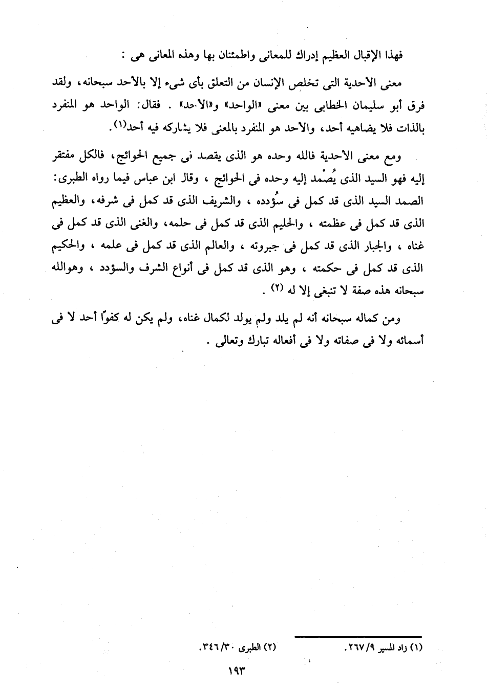 الصمد السيد الذى قد كمل فى سؤدده، والشريف الذى قد كمل فى شرفه، والعظيم الذى قد كمل فى عظمته، والحليم الذى قد كمل فى حلمه، والغنى الذى قد كمل فى غناه، والجبار الذى قد كمل فى جبروته، والعالم الذى قد كمل فى علمه، والحكيم الذى قد كمل فى حكمته، وهو الذى قد كمل فى أنواع الشرف والسؤدد، وهو الله سبحانه هذه صفة لا تنبغى إلا له «2».
