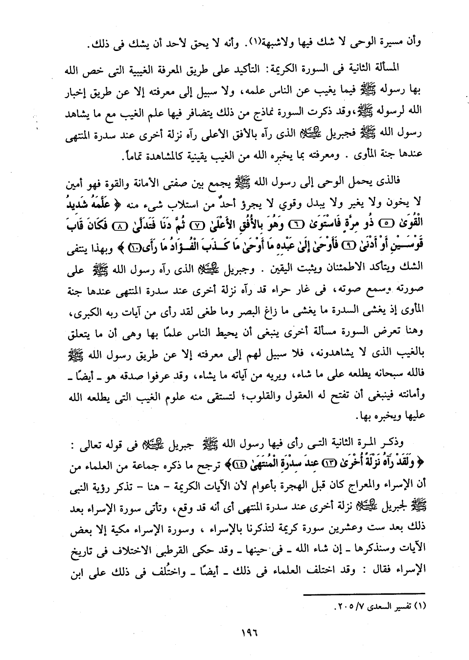 المسألة الثانية فى السورة الكريمة: التأكيد على طريق المعرفة الغيبية التى خص الله بها رسوله صلّى الله عليه وسلم فيما يغيب عن الناس علمه، ولا سبيل إلى معرفته إلا عن طريق إخبار الله لرسوله صلّى الله عليه وسلم، وقد ذكرت السورة نماذج من ذلك يتضافر فيها علم الغيب مع ما يشاهد رسول الله صلّى الله عليه وسلم فجبريل عليه السّلام الذى رآه بالأفق الأعلى رآه نزلة أخرى عند سدرة المنتهى عندها جنة المأوى. ومعرفته بما يخبره الله من الغيب يقينية كالمشاهدة تماما.